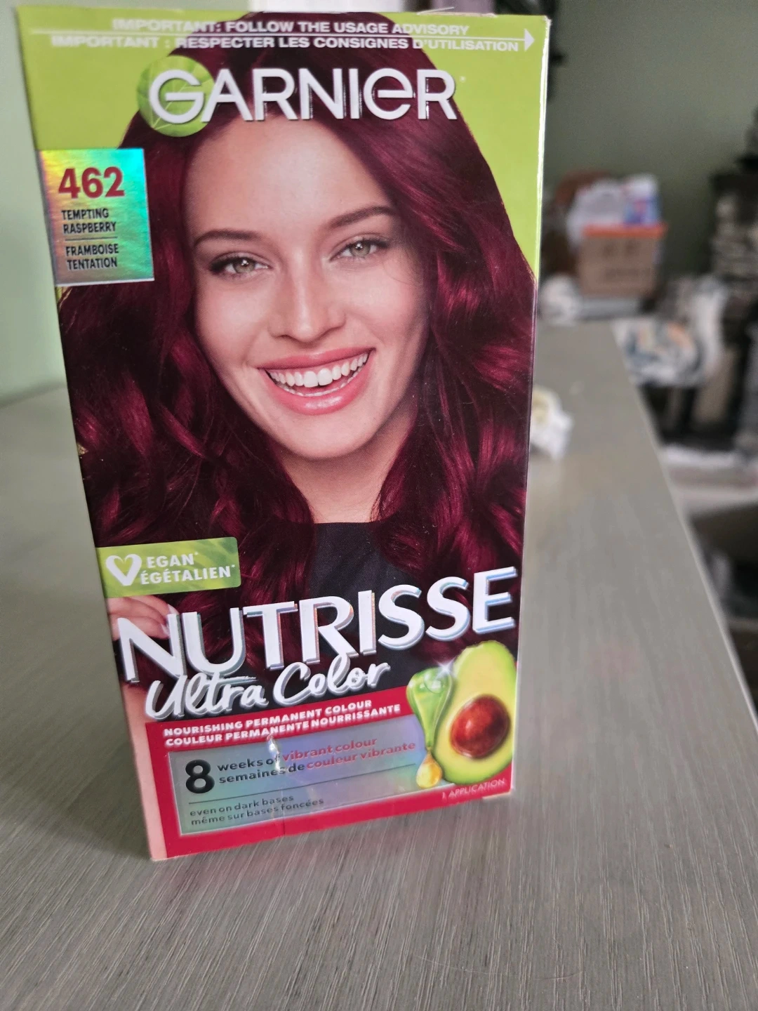 Garnier Nutrisse Ultra Color nourishing permanent hair dye in shade 462 Tempting Raspberry. It provides 8 weeks of vibrant colour, even on dark bases.