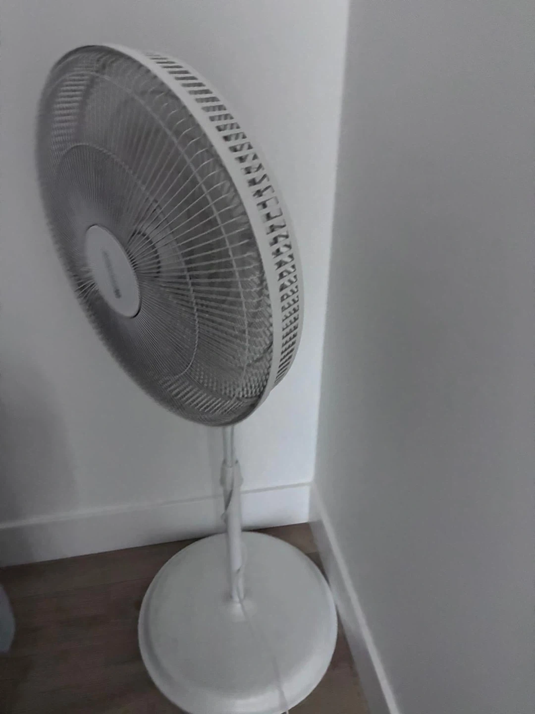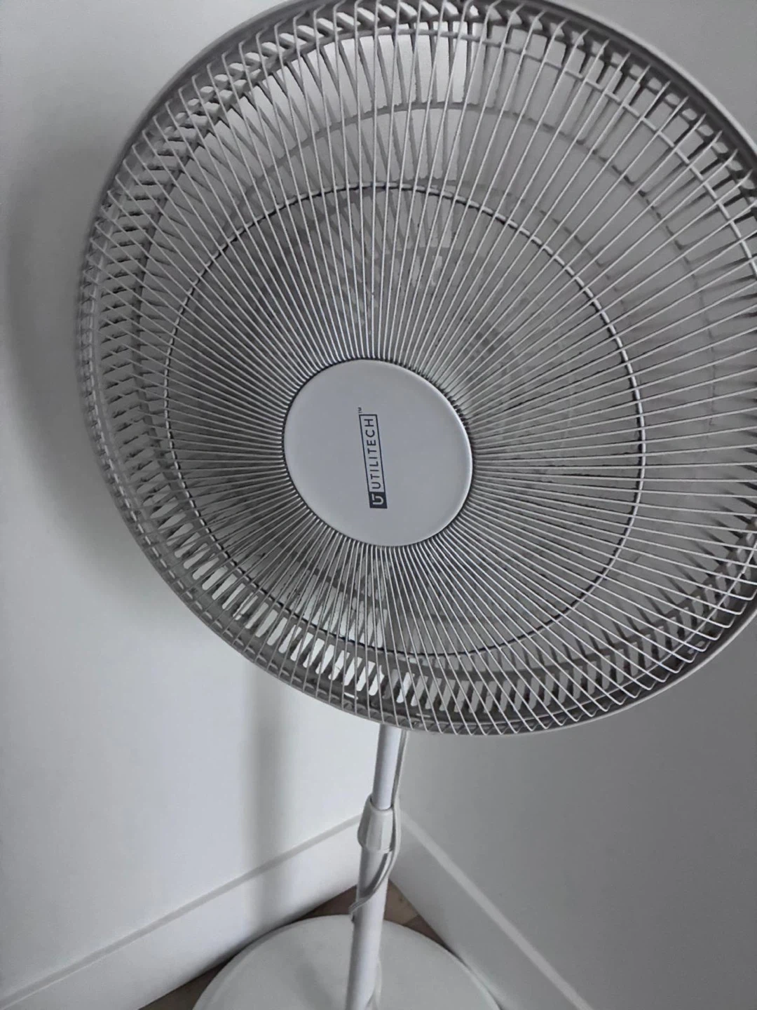 This Utilitech pedestal fan is white. It has a sturdy base and adjustable height. Keeps your space cool and comfortable!