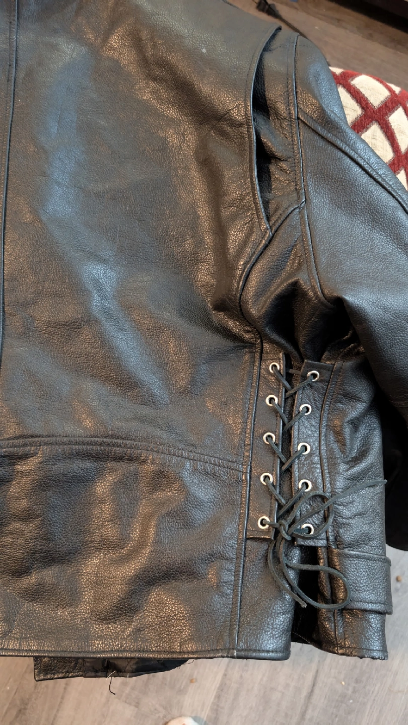 Selling a classic FMC men's motorcycle jacket in black leather. It's a size 64 and features a quilted lining. The style number is M 205. The lining is made of Taffeta. It's in great condition and ready for the road! Near perfect condition, worn only a handful of times!