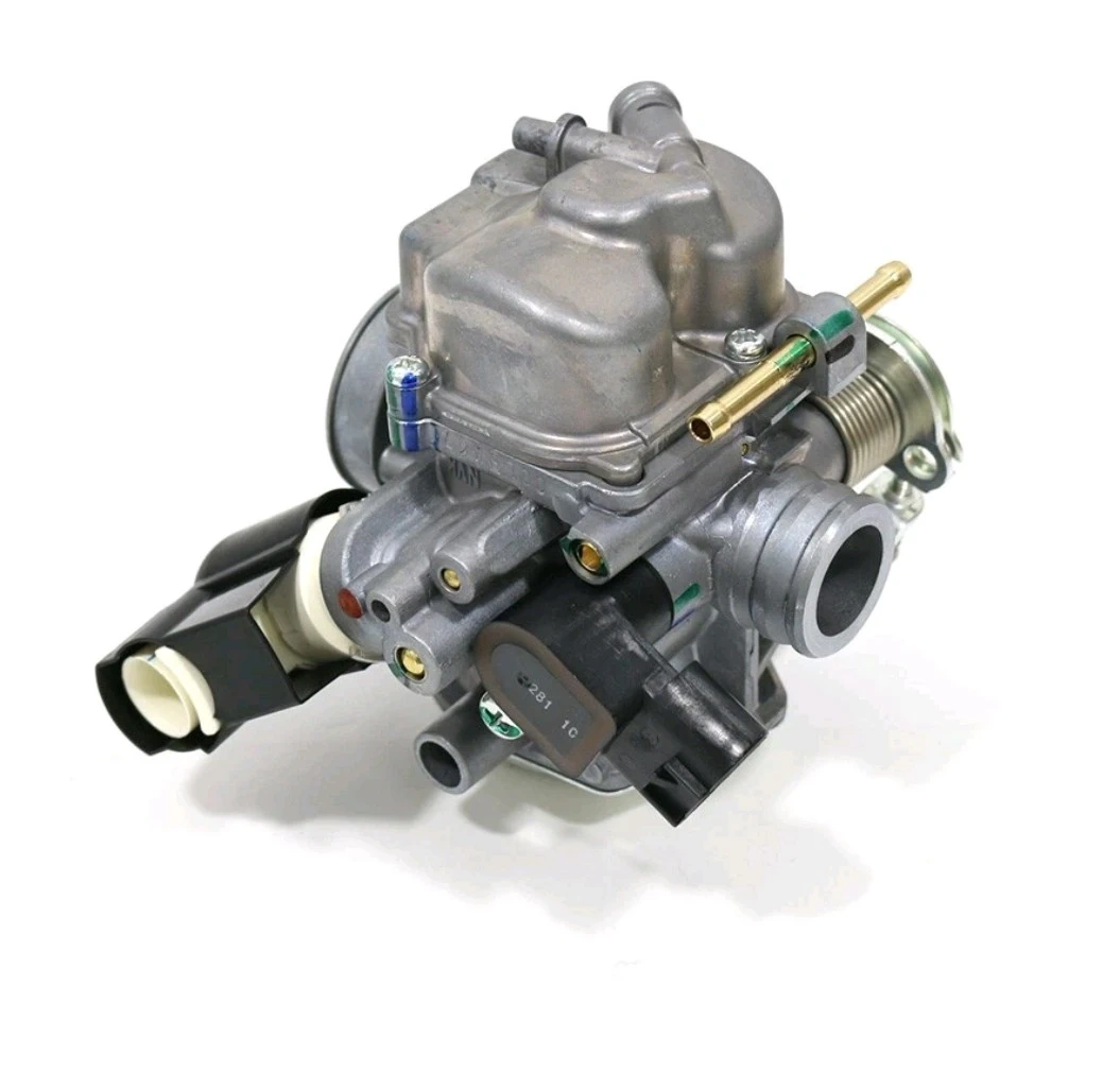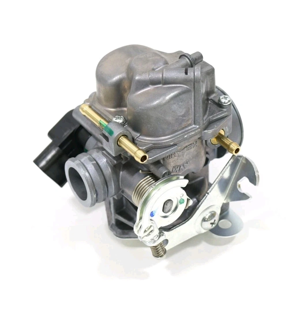 This is a motorcycle carburetor, likely for a scooter or small engine. It's made of metal and includes a fuel filter. It appears to be a replacement part for engine maintenance. This component is essential for fuel delivery to the engine.