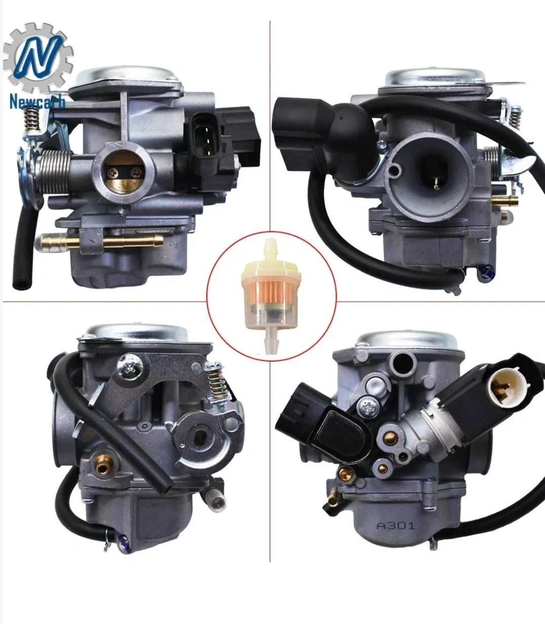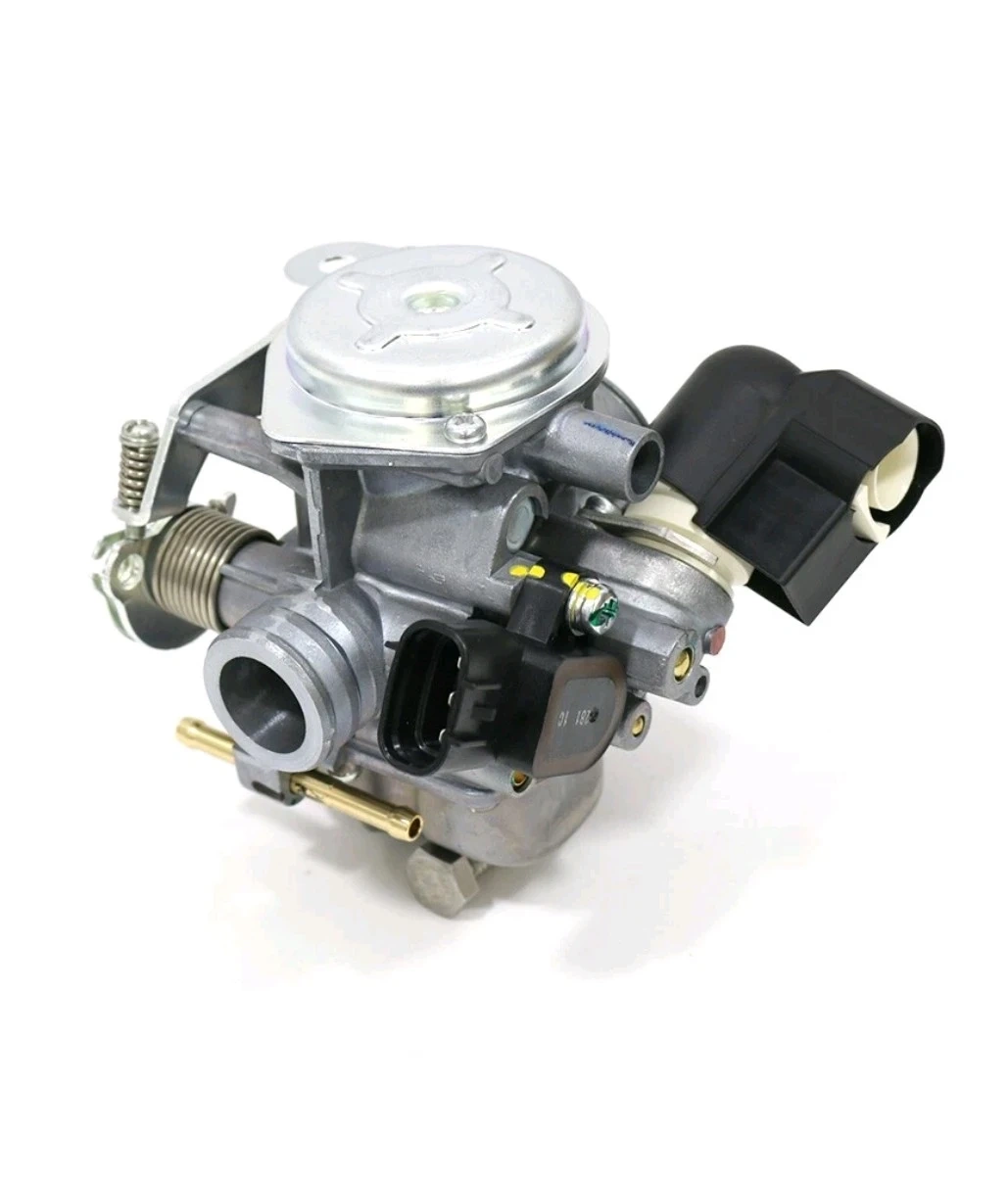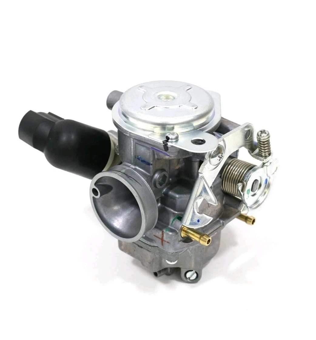 This is a motorcycle carburetor, likely for a scooter or small engine. It's made of metal and includes a fuel filter. It appears to be a replacement part for engine maintenance. This component is essential for fuel delivery to the engine.