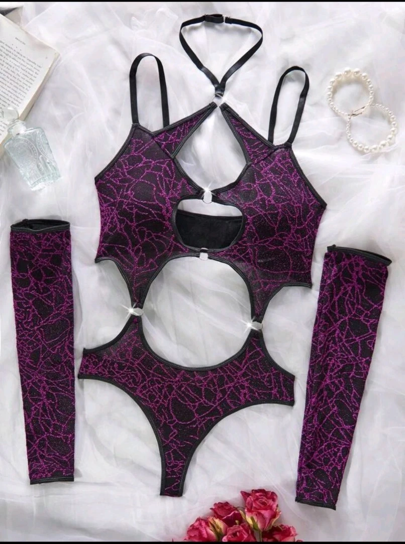 This is a sheer purple lace teddy with cutout details and attached arm sleeves. It includes a choker neck strap and ring accents. Made from a blend of nylon and spandex for stretch. I have 100 of them I am selling them each individual