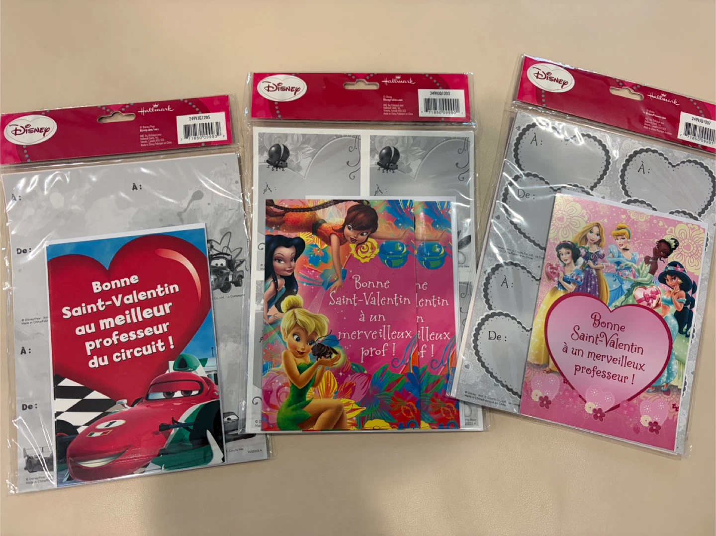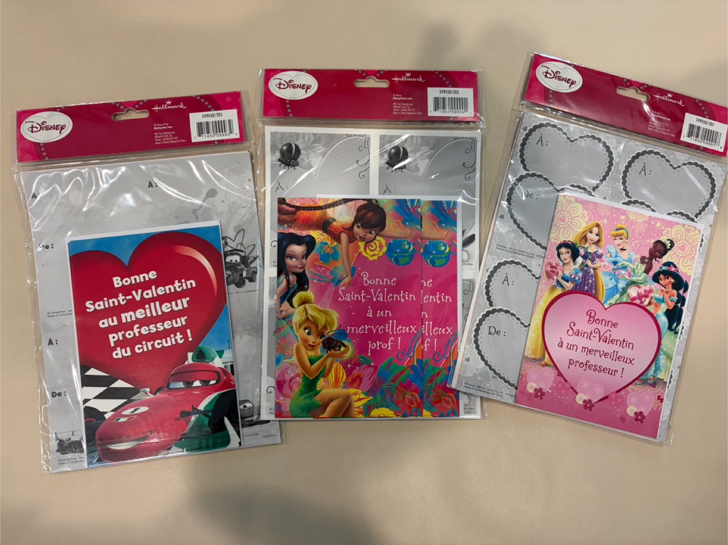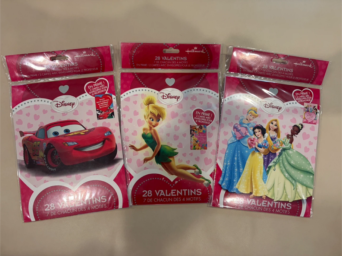 Hallmark Disney French Valentines - 28 Cards x 3 packs Selling three packs of Hallmark French Disney Valentines cards! Each pack contains 28 valentines with 7 of each of 4 designs. Perfect for your little one to give to their classmates or friends! Perfect for French immersion schools or preschools! These are brand new in packages. Price is for the lot or $2 each pack. Price is firm. All my items are from a smoke free home.