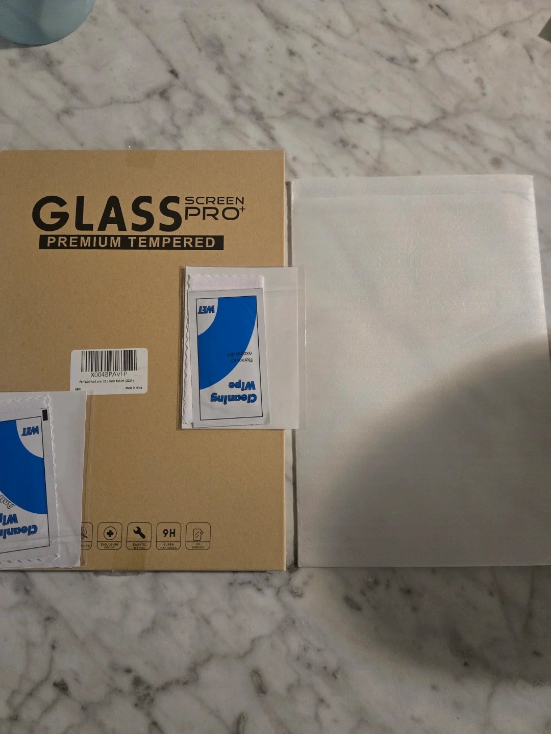 This is a premium tempered glass screen protector for a tablet. It's designed for easy installation and offers 9H hardness. Cleaning wipes are included for prep.