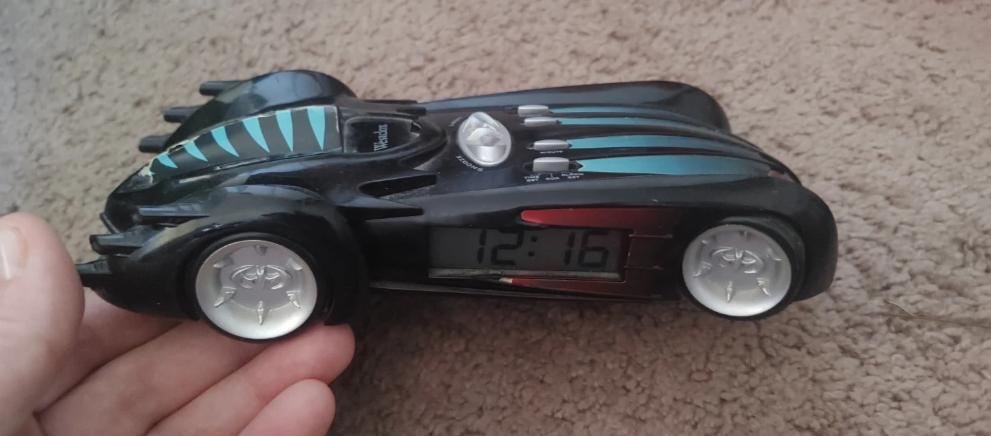 Selling a vintage 1997 Batman Batmobile alarm clock made by Westclox! It's a unique piece for any Batman collector or anyone who loves retro items. The model number is 32500. This cool alarm clock is shaped like the Batmobile and would look great on a bedside table!