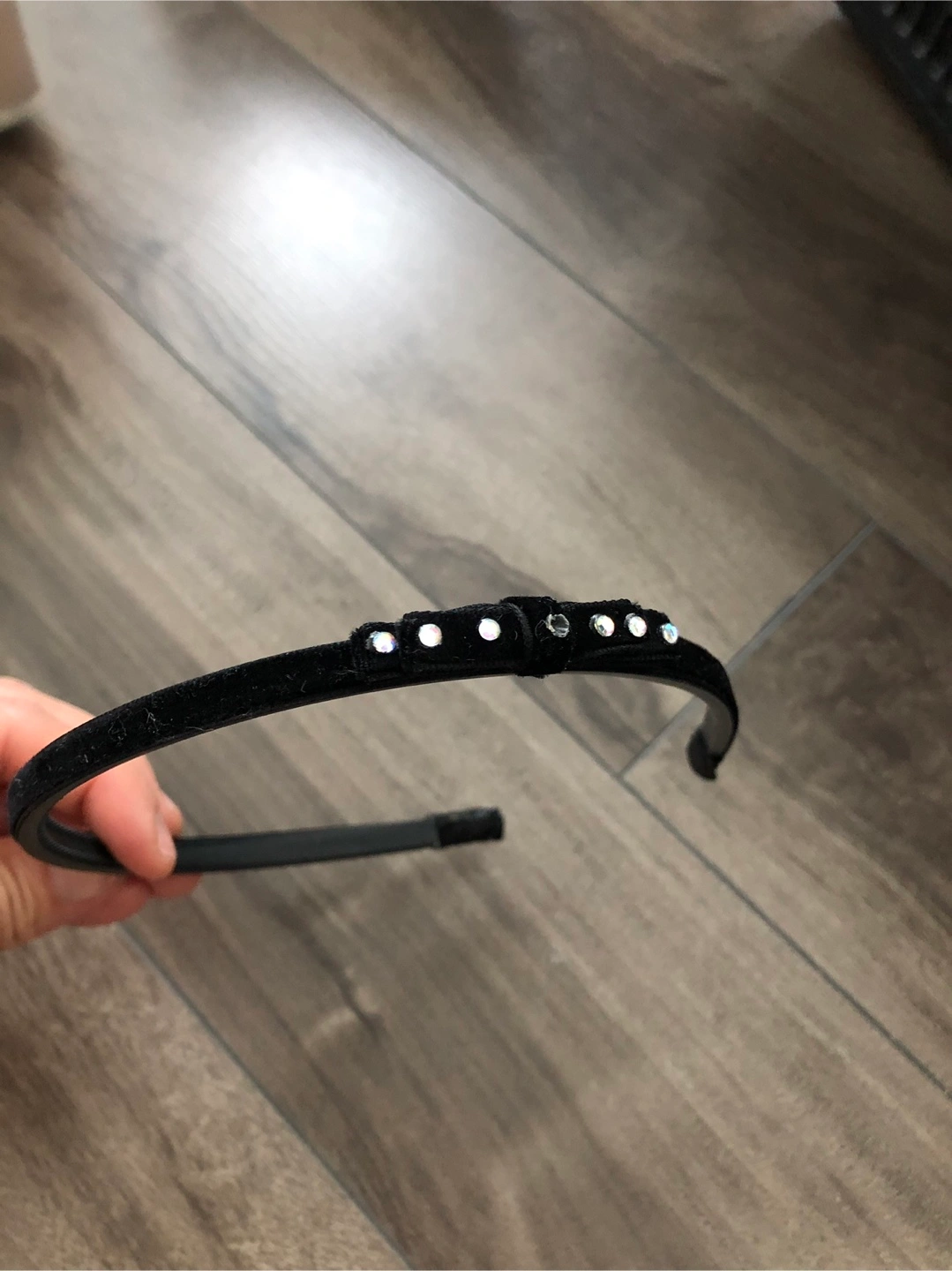WHere's a cute black headband! It features small jewels (one missing on the bow). Perfect for adding a little sparkle to your outfit!