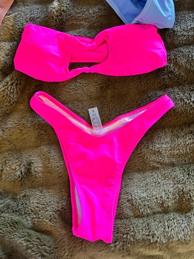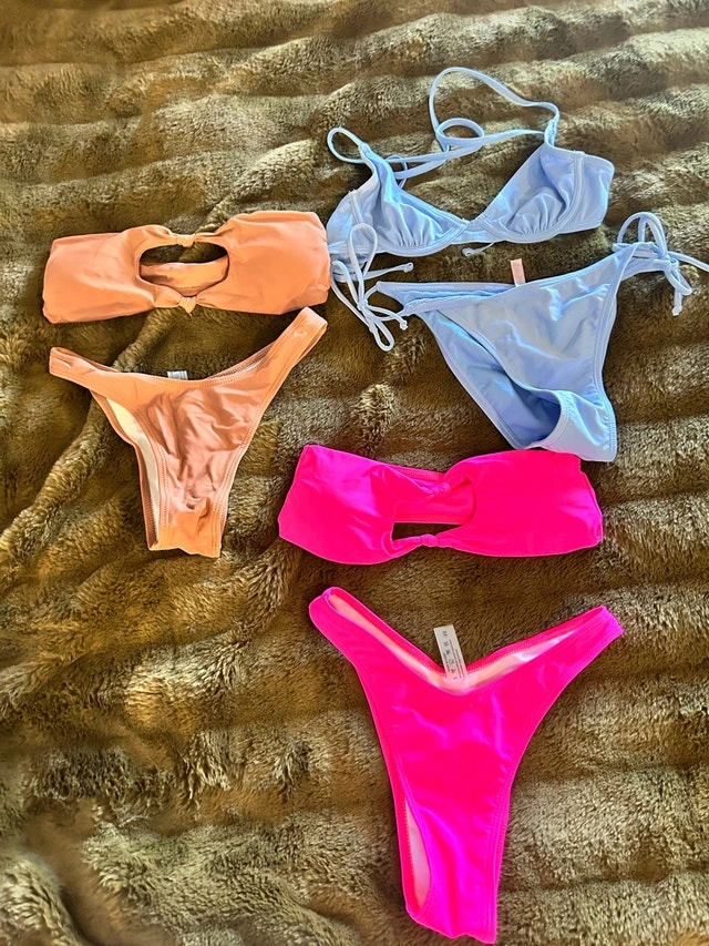 Get ready for summer with these adorable women's size XS bikinis! This lot includes three different styles and colours, perfect for mixing and matching at the beach or pool. These bikinis are in used, but good condition. Sizes are XS. Colours include Pink, Blue, and Peach. If you're seeing this ad, they are still available.