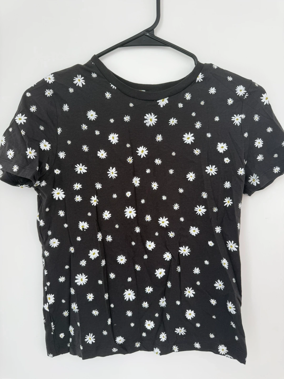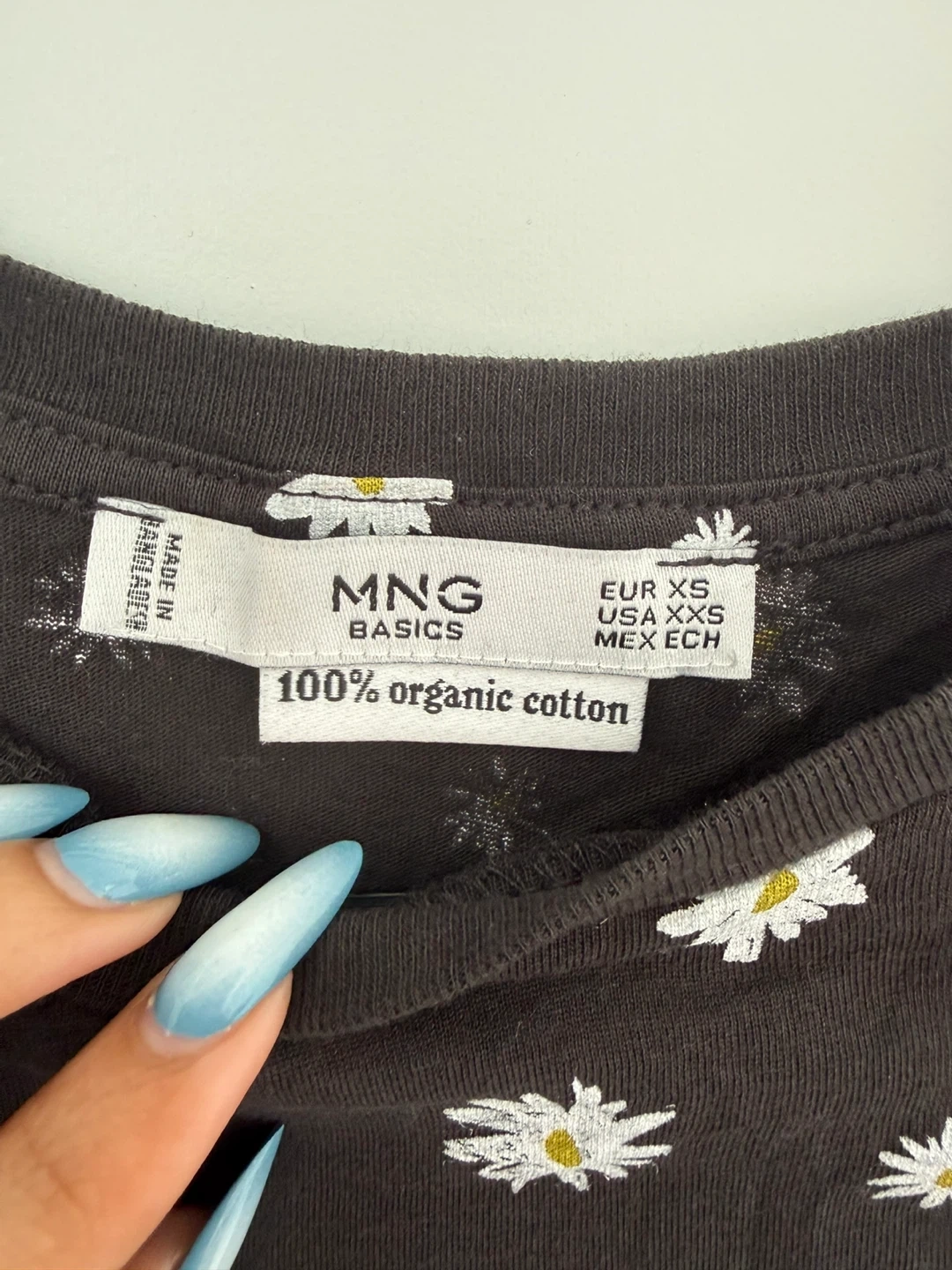 This is a black MNG Basics t-shirt. It's made of 100% organic cotton. The shirt features a fun white daisy print all over. This tee is a size EUR XS.