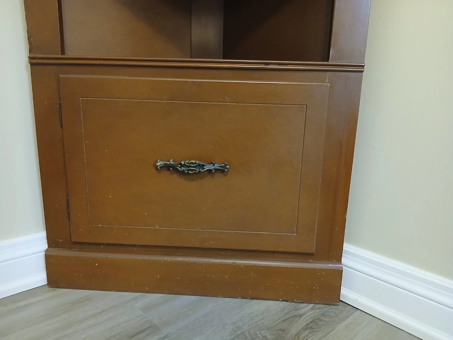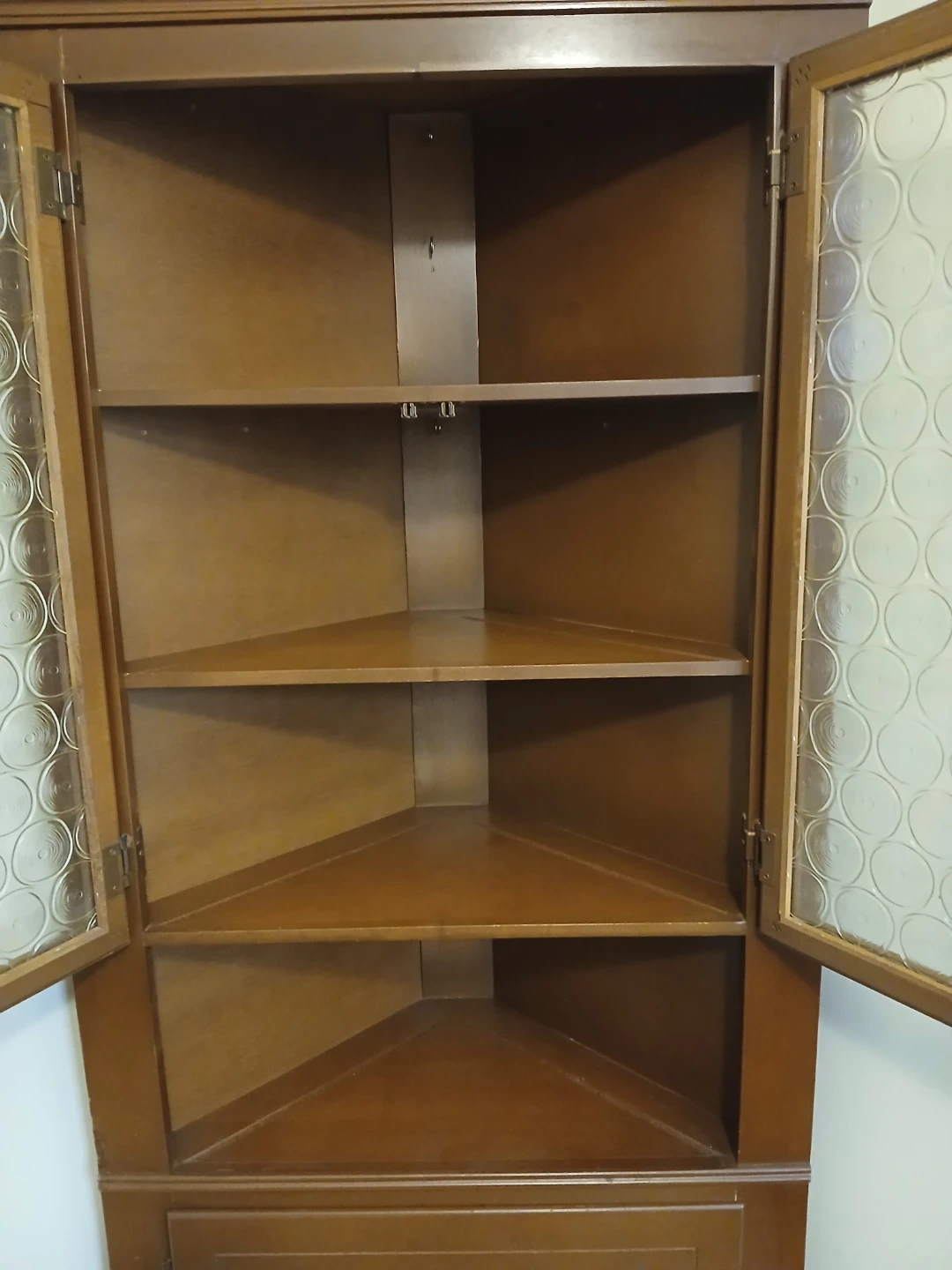 Here's a lovely wooden corner cabinet! It features glass doors on the top section and a drawer at the bottom. It's perfect for adding some extra storage and a touch of charm to any room.