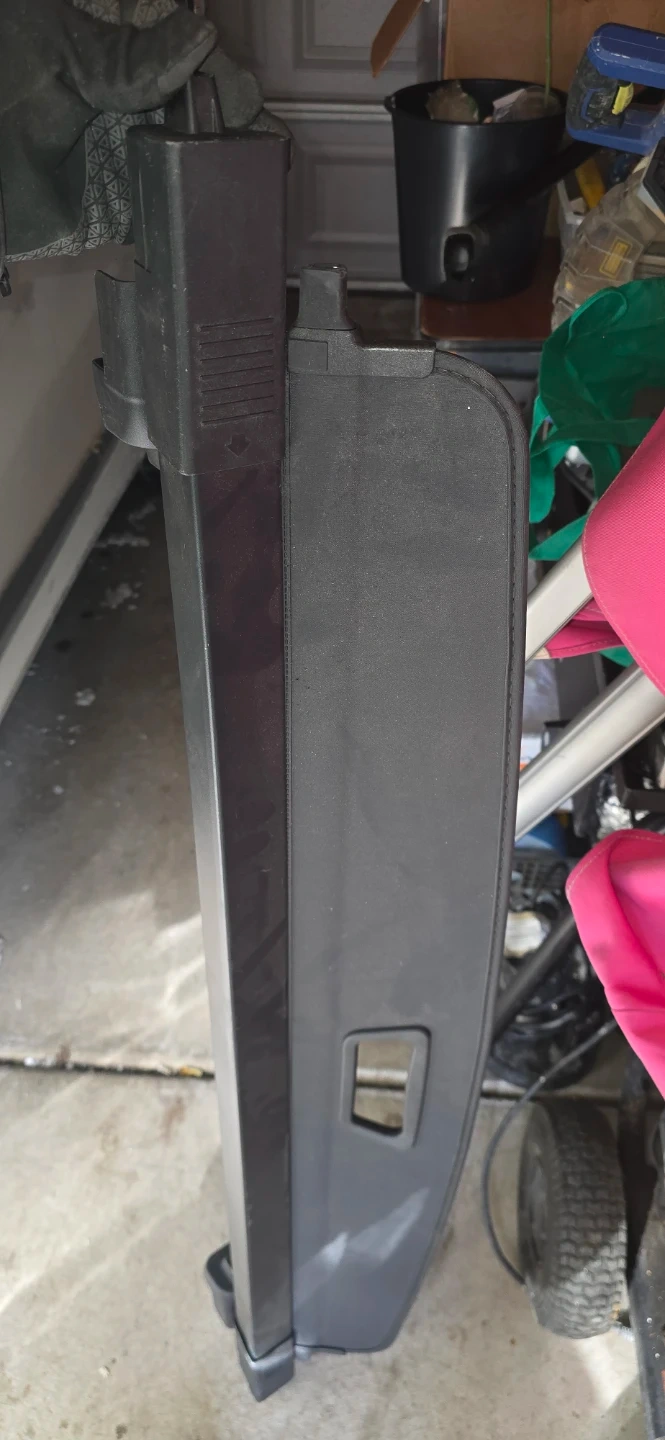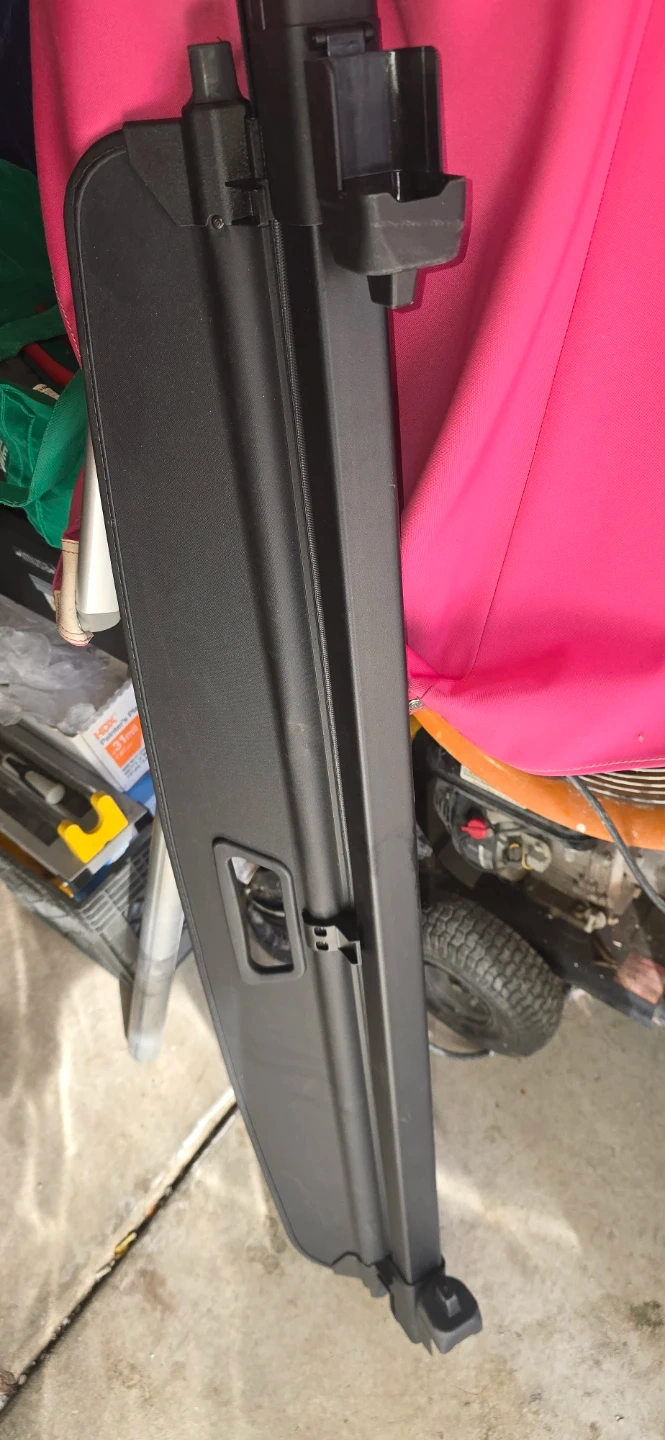 This is a black cargo cover, also known as a tonneau cover. It's designed to keep items in your trunk or cargo area out of sight. It appears to be made of durable fabric and plastic components. This would be useful for anyone wanting to secure and hide items in their vehicle's cargo space. This its for dodge durango 2023 to 2025