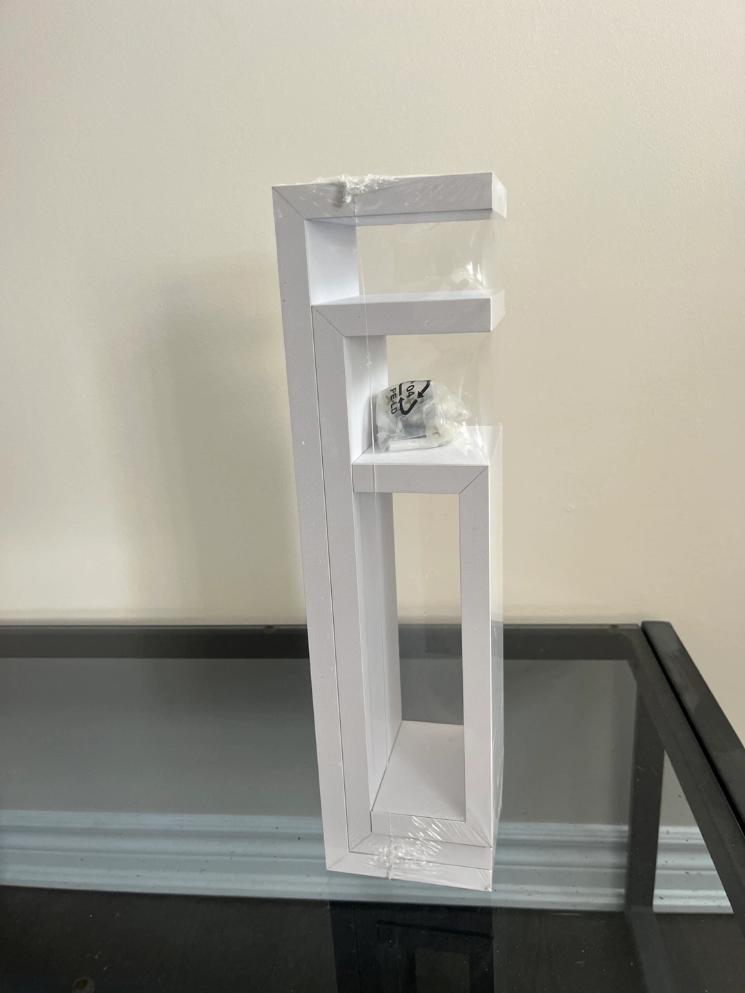 Three-piece white floating shelf set. Modern design. Perfect for displaying decor or books. New in packaging. Includes mounting hardware.