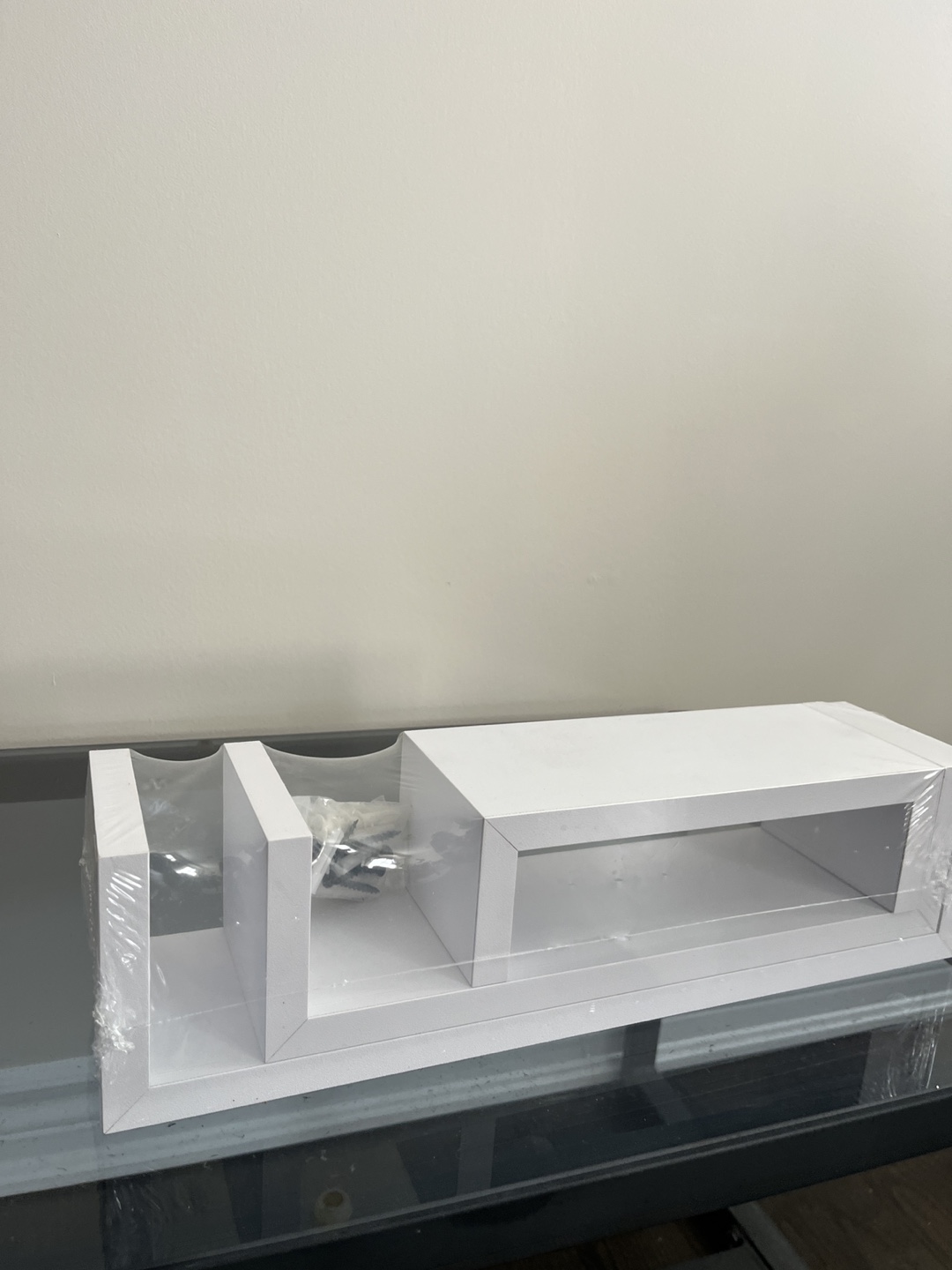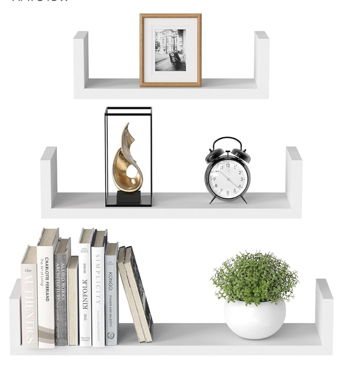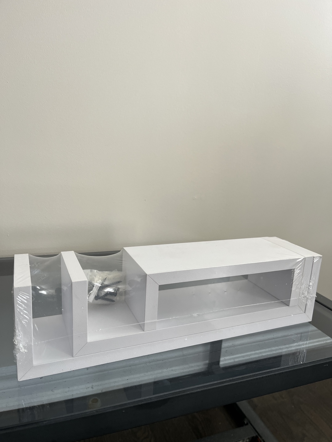 Three-piece white floating shelf set. Modern design. Perfect for displaying decor or books. New in packaging. Includes mounting hardware.