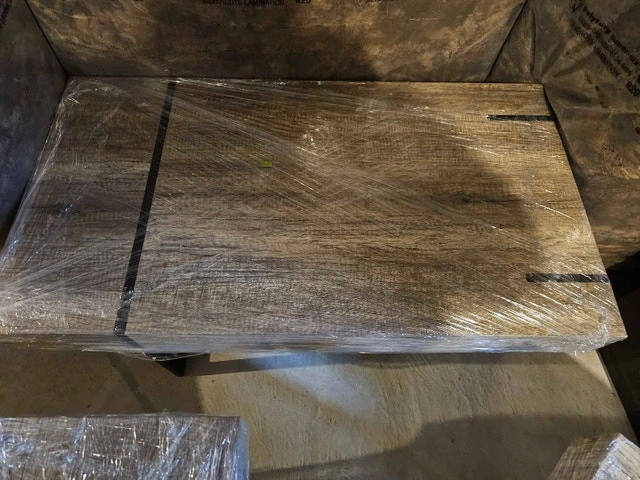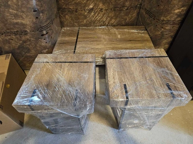 Selling a new, high-quality coffee table and two matching side tables, perfect for adding a a touch of elegance to any living room. These tables have never been used and are still wrapped in their original packaging. Coffee Table Dimensions: 43" (L) x 23" (W) x 16" (H). Side Table Dimensions: 19 3/4" (L) x 19 3/4" (W) x 22.5" (H). Material: Solid wood with a beautiful veneer finish. Colour: Rich brown. The stands are metal with metal accents on the topside of the tables. Style: Modern, minimalist design. These tables are in pristine condition, ready to be the centrepiece of your living space or a stylish addition to your bedroom. It's a fantastic opportunity to own a high-end set at a great value!