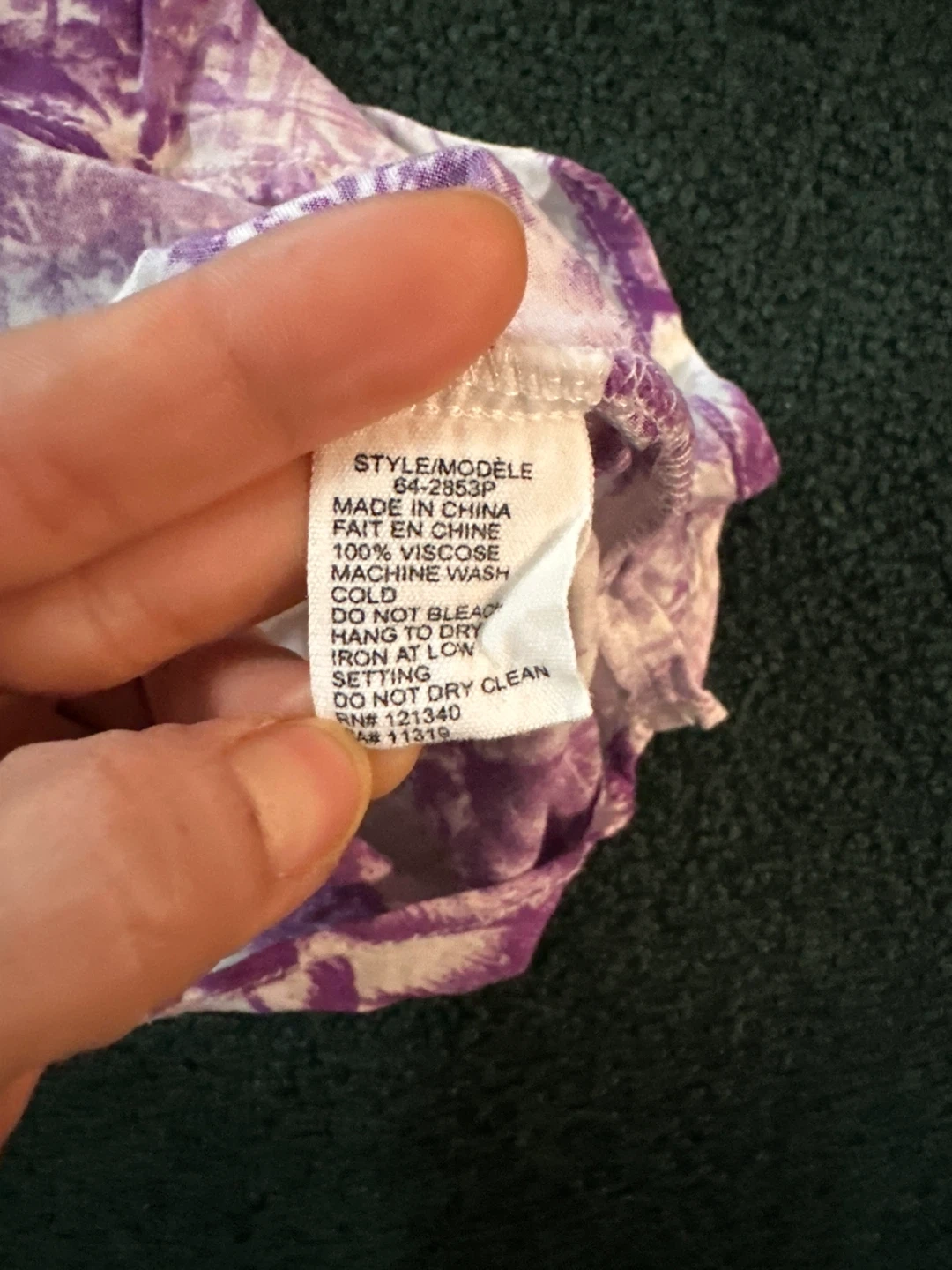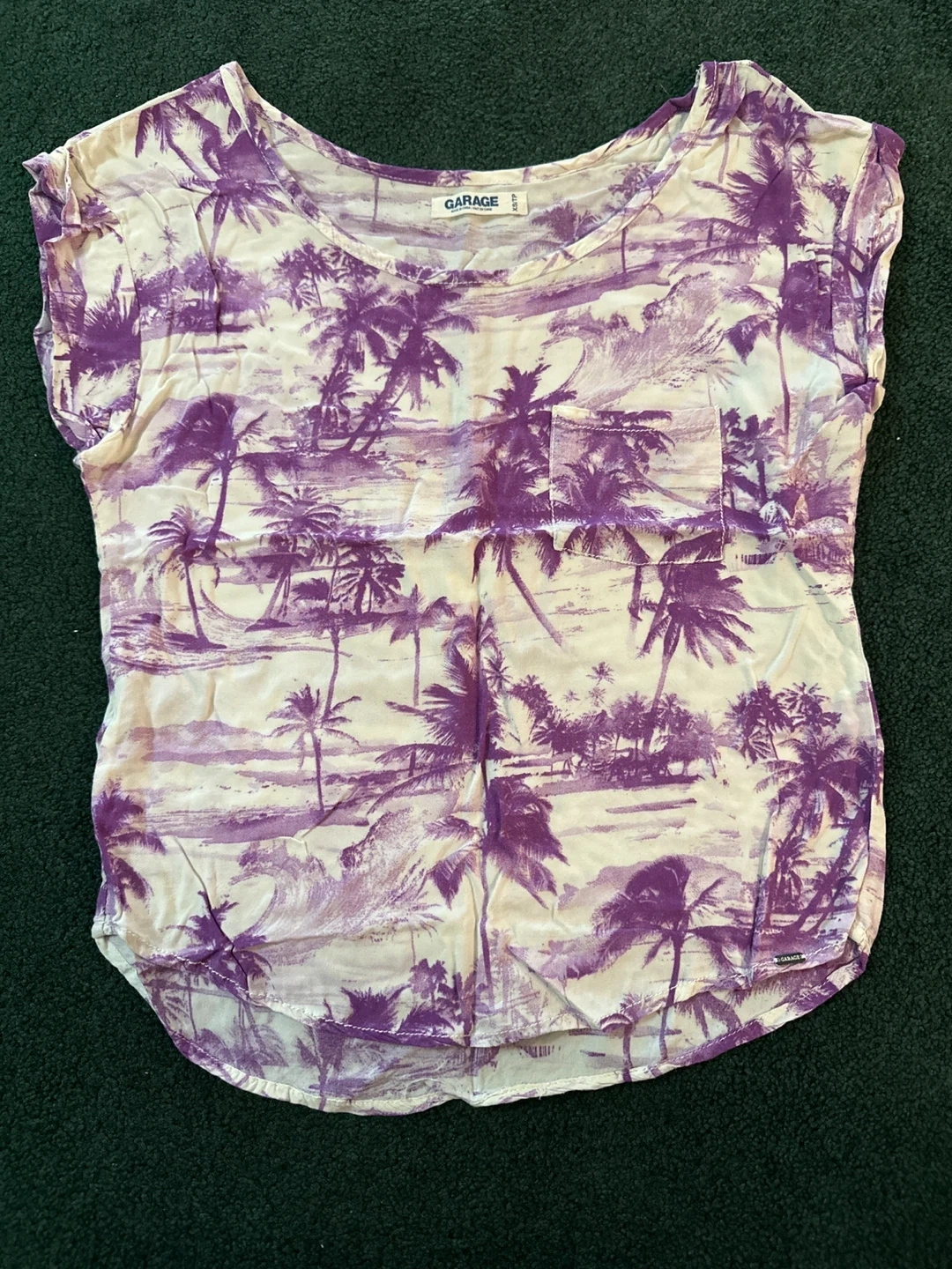 This Garage t-shirt has a fun purple palm tree print. It's made of 100% viscose fabric. Machine wash cold. This shirt is great for casual wear! Super comfy and fresh for summer.