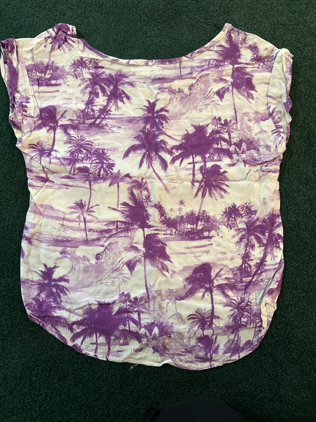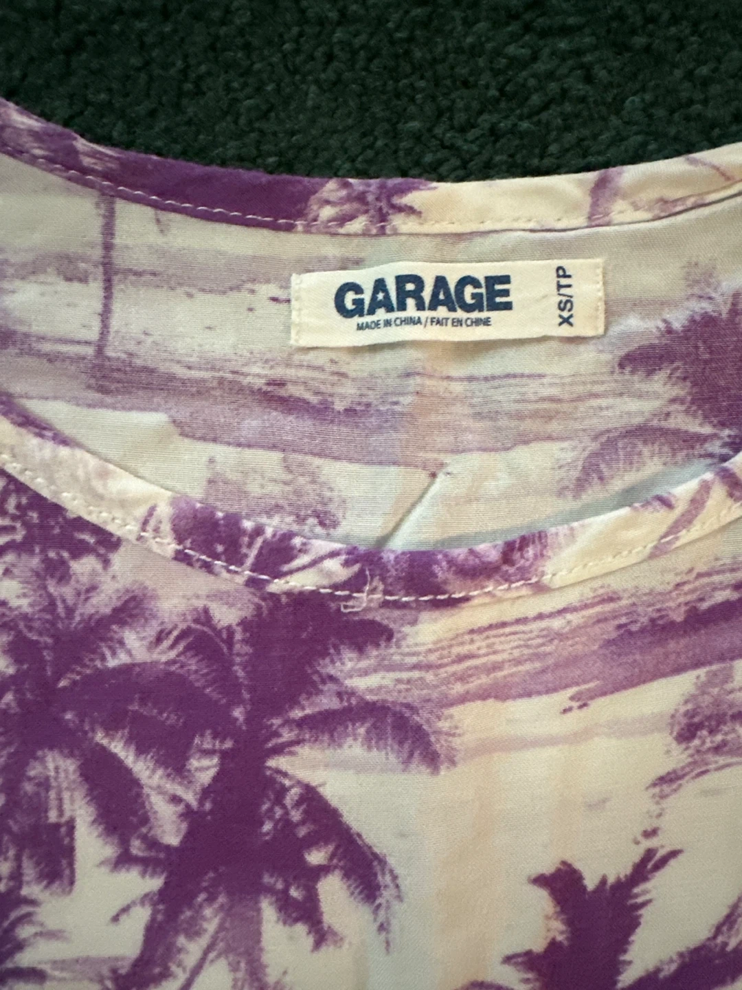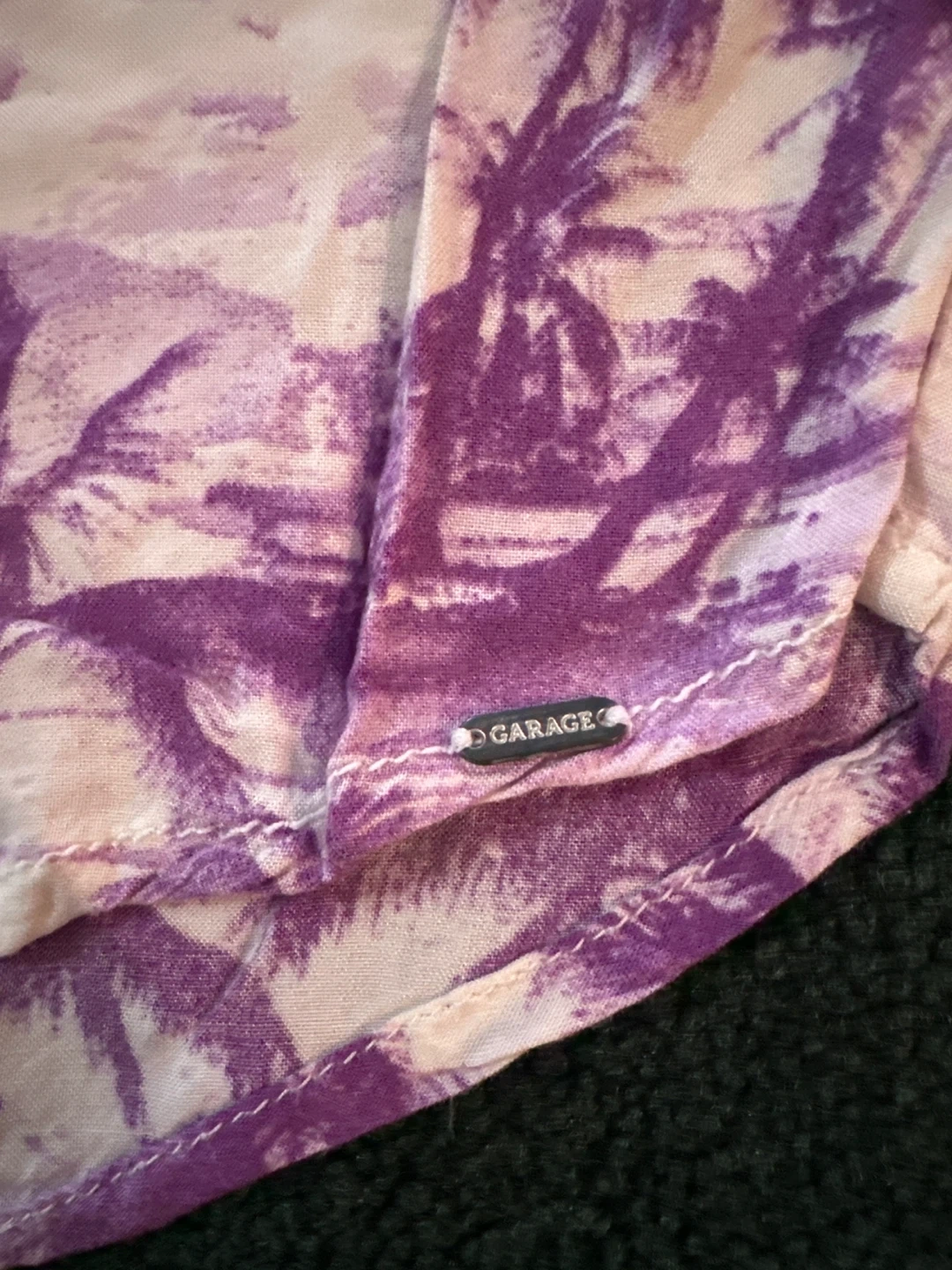 This Garage t-shirt has a fun purple palm tree print. It's made of 100% viscose fabric. Machine wash cold. This shirt is great for casual wear! Super comfy and fresh for summer.
