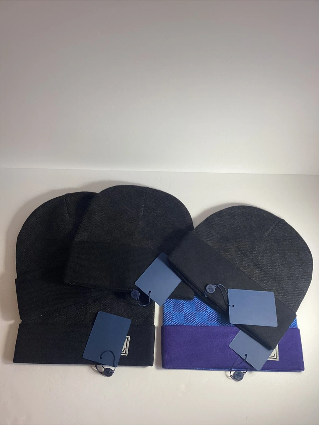Two Louis Vuitton beanies are available, one in black and another with a blue and purple checkered pattern. They come with tags attached.