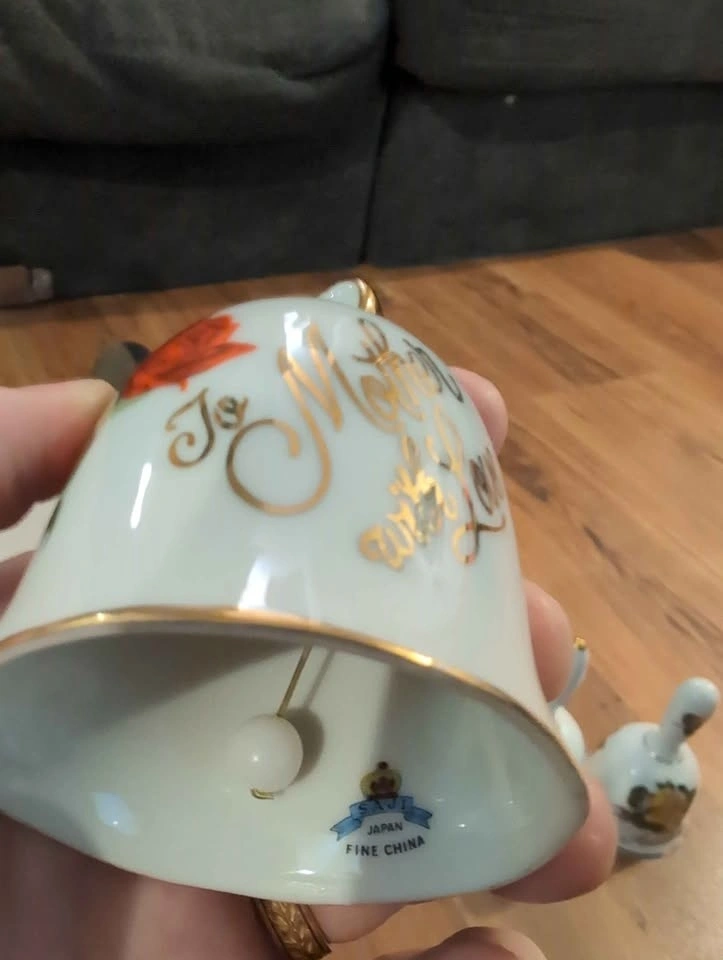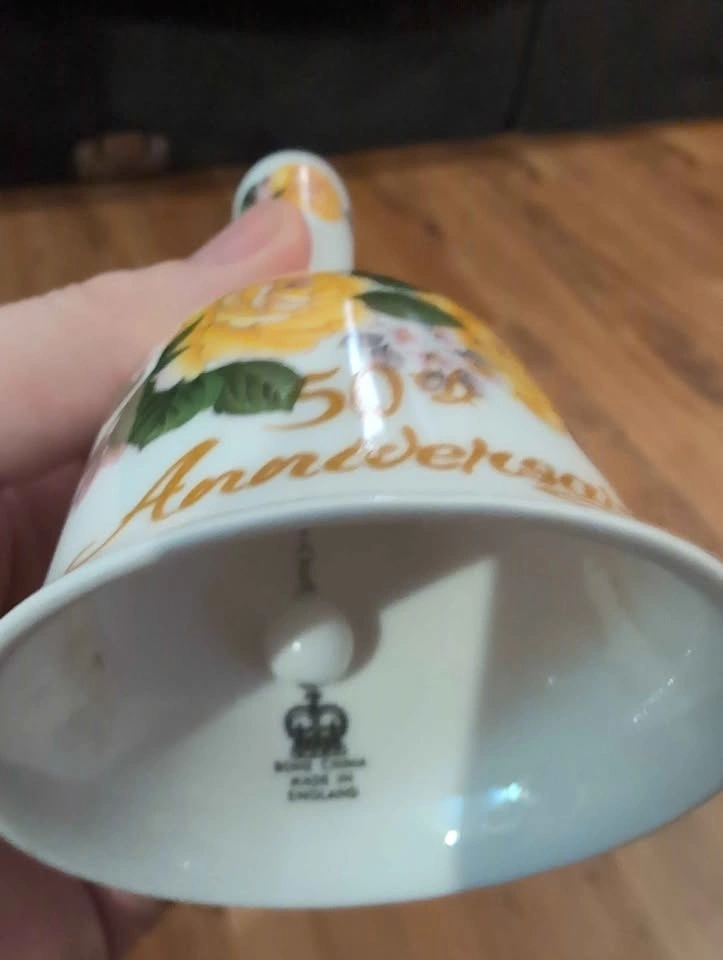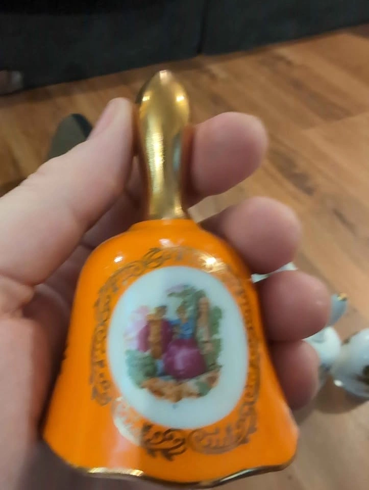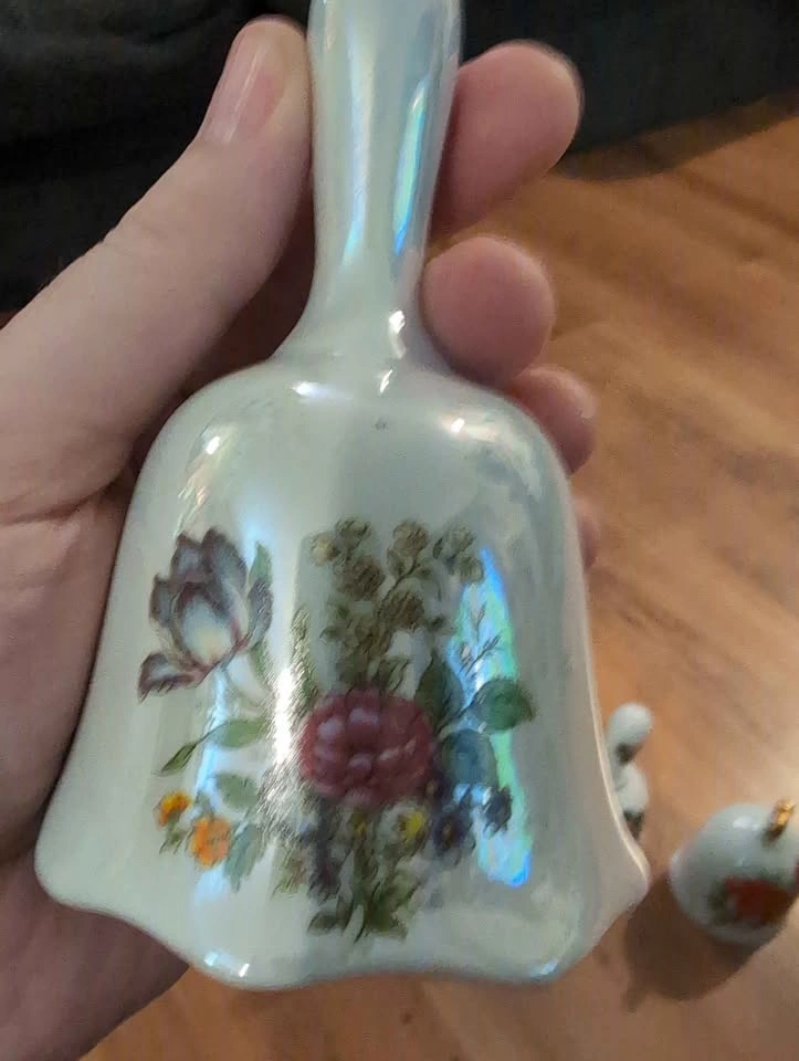 Set of 7 vintage porcelain hand bells with floral, souvenir, winter scene, and anniversary designs. Includes pieces marked Galway Irish Crystal and Saji Japan Fine China. Nice decorative collection for display or for bell collectors. $35 for the set. Pickup: Surrey Central, Guildford Mall, or New Westminster Quay.