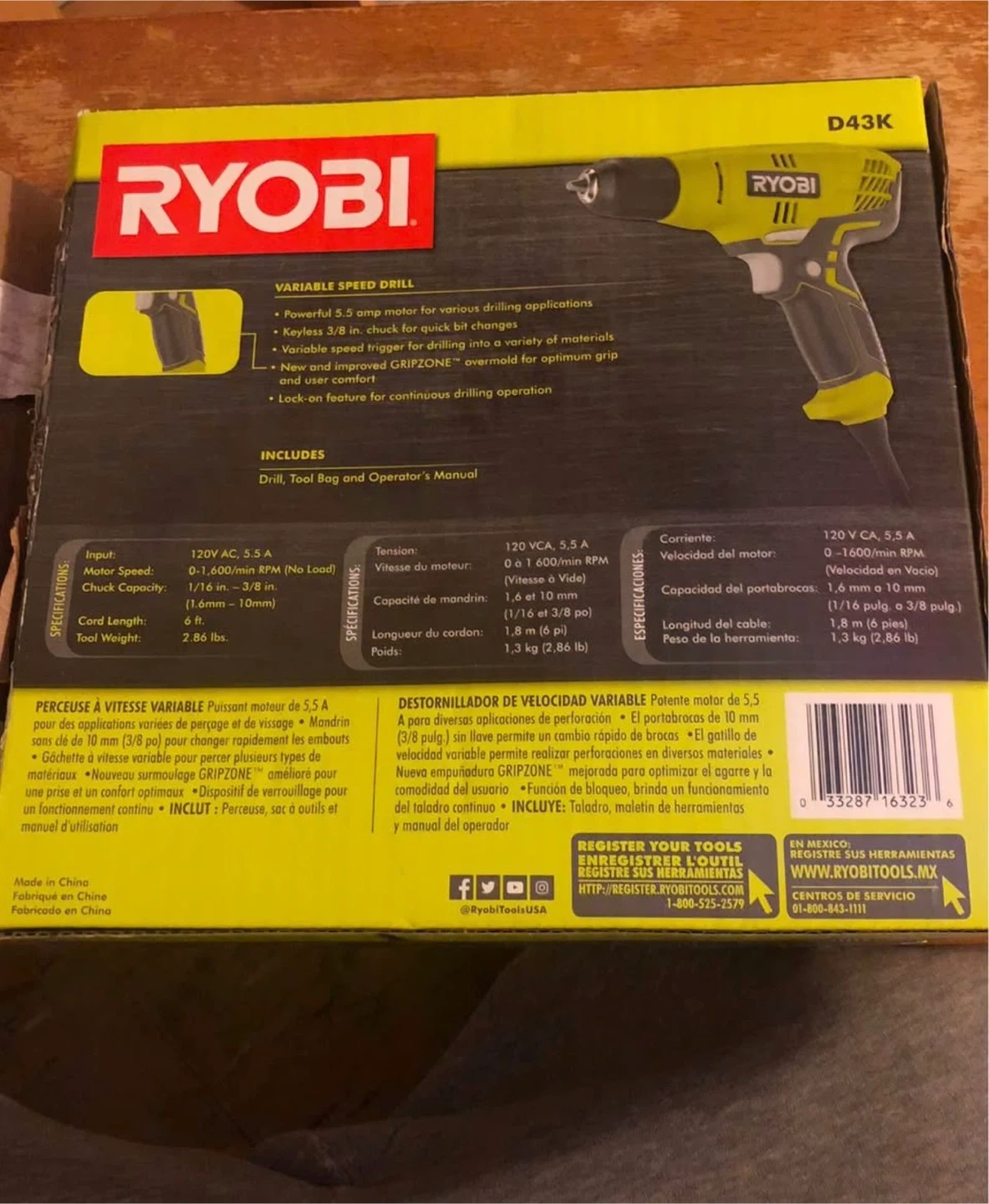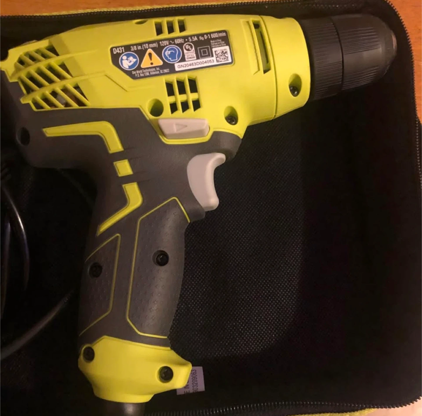 Ryobi variable speed drill with 5.5 amp motor. It's a keyless 3/8 in. chuck model. Includes the drill, tool bag, and operator's manual.
