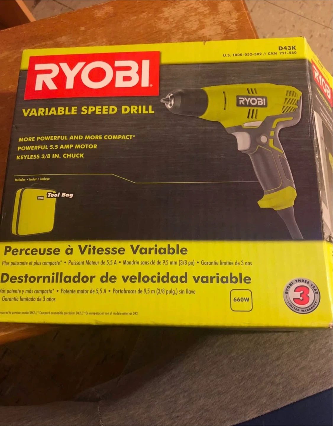 Ryobi variable speed drill with 5.5 amp motor. It's a keyless 3/8 in. chuck model. Includes the drill, tool bag, and operator's manual.