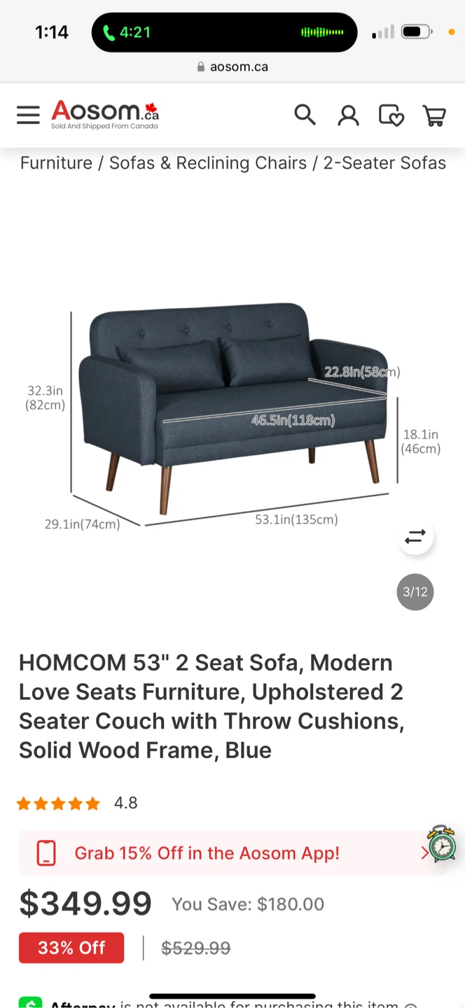 Selling an Aosom HOMCOM 53" 2-seat sofa! It's a modern love seat style with upholstered cushions and a solid wood frame. The colour is a beautiful blue.