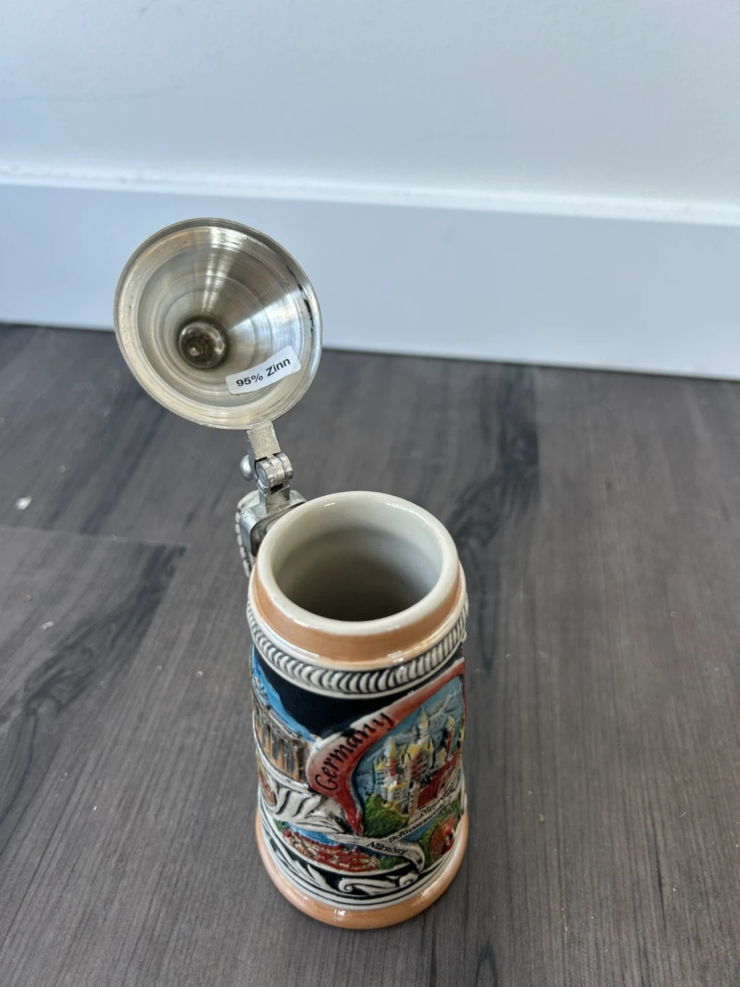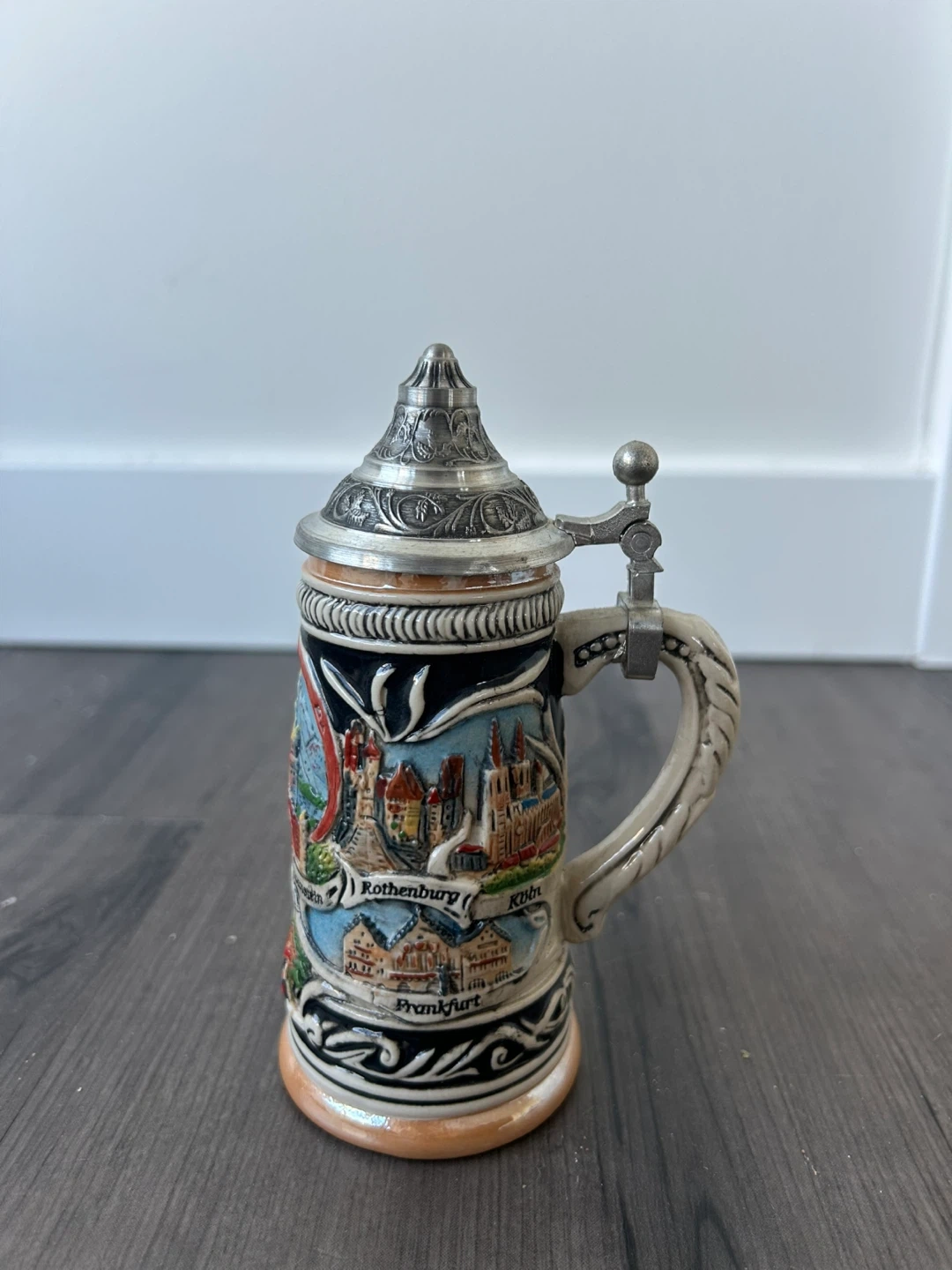 Originally 30€ Ceramic stein featuring German city scenes. Features a metal lid with "95% Zinn" marking. Made in Germany.