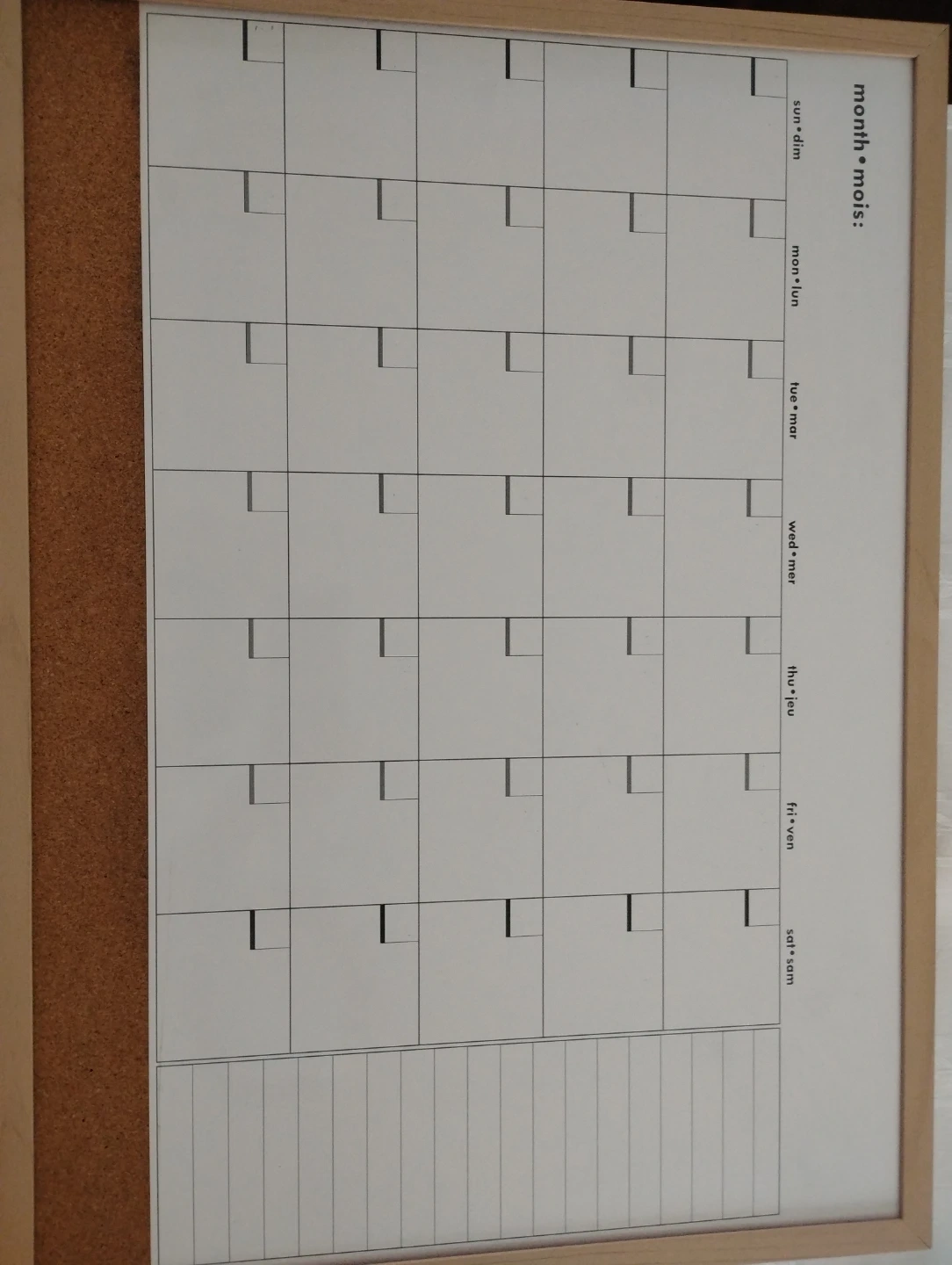 Dry erase monthly calendar board with a wood-look frame. Includes space for notes at the bottom. Perfect for organizing your schedule!