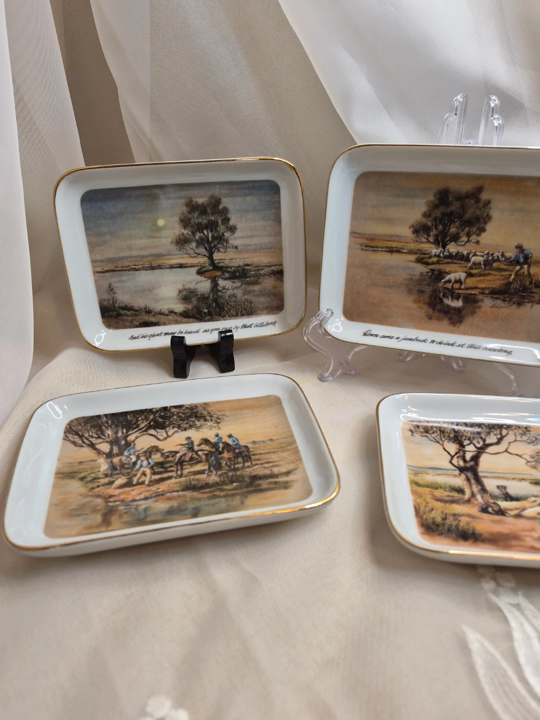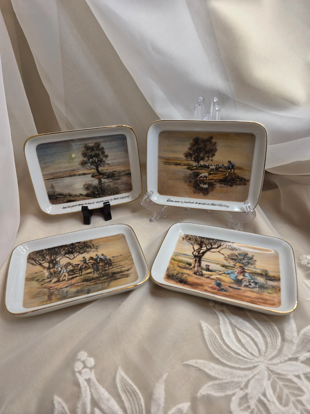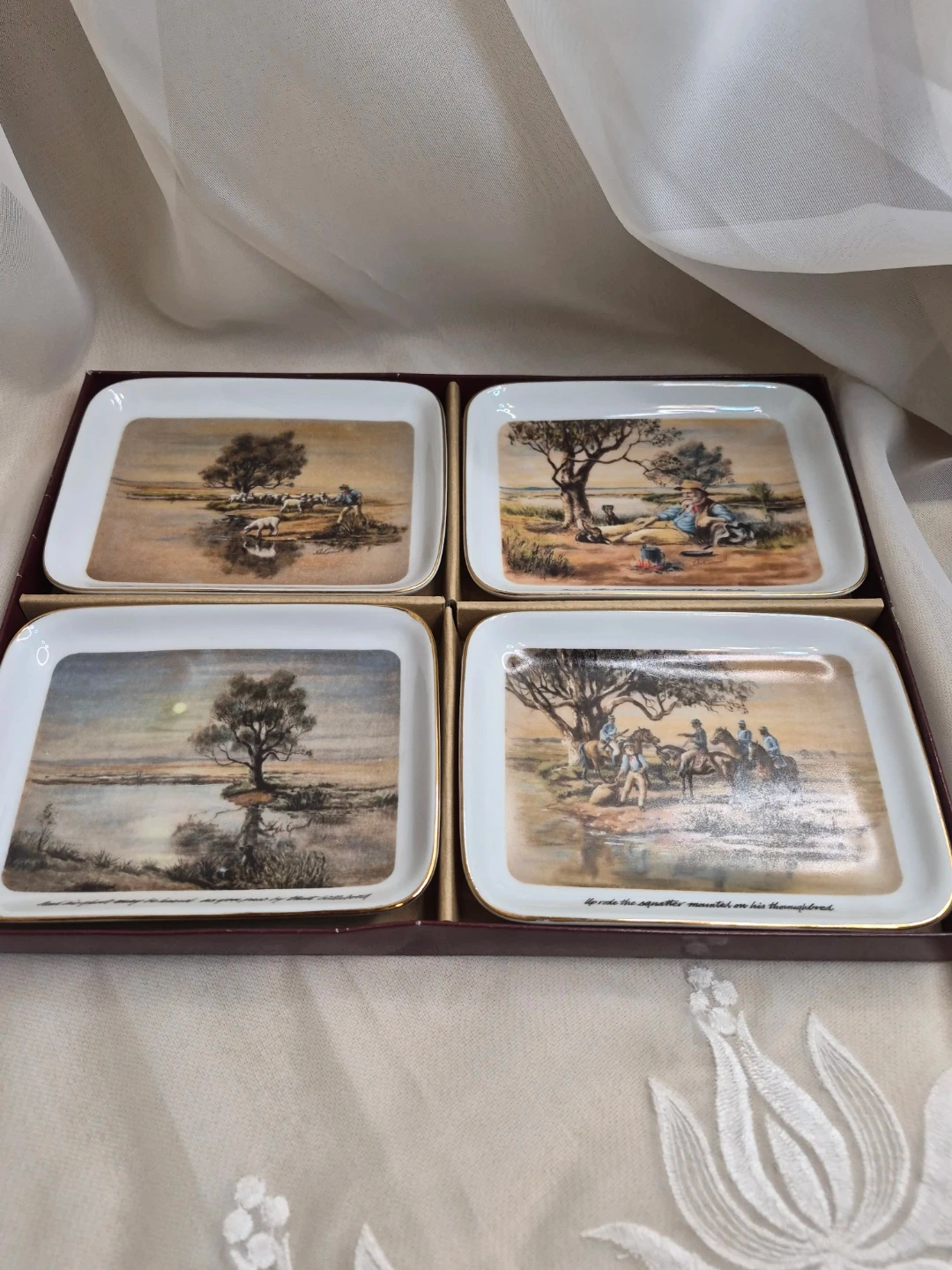 The Waltzing Matilda Collection by Webb of Australian Scenes Set of 4 Porcelain Decorative Dishes 5 1/2" x 4" Brand New with old box please see all pictures