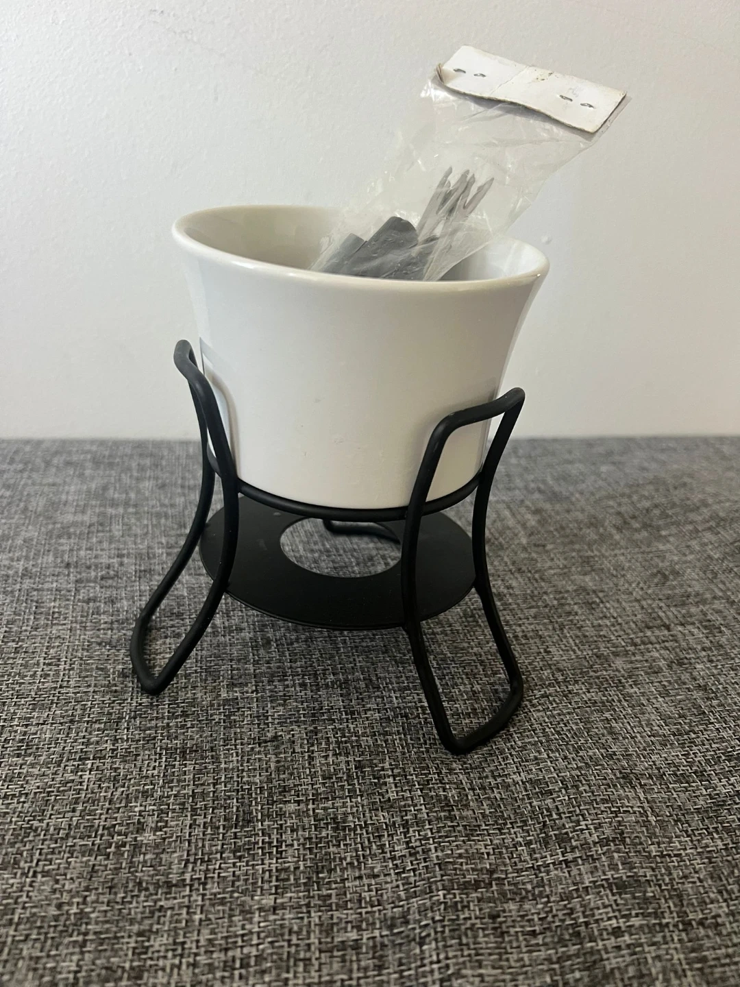 This is a white ceramic fondue pot set with a black metal stand. It includes four fondue forks with plastic handles. Perfect for a cozy night in!