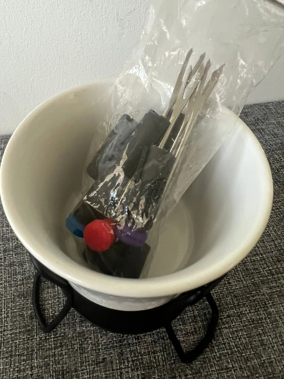 This is a white ceramic fondue pot set with a black metal stand. It includes four fondue forks with plastic handles. Perfect for a cozy night in!