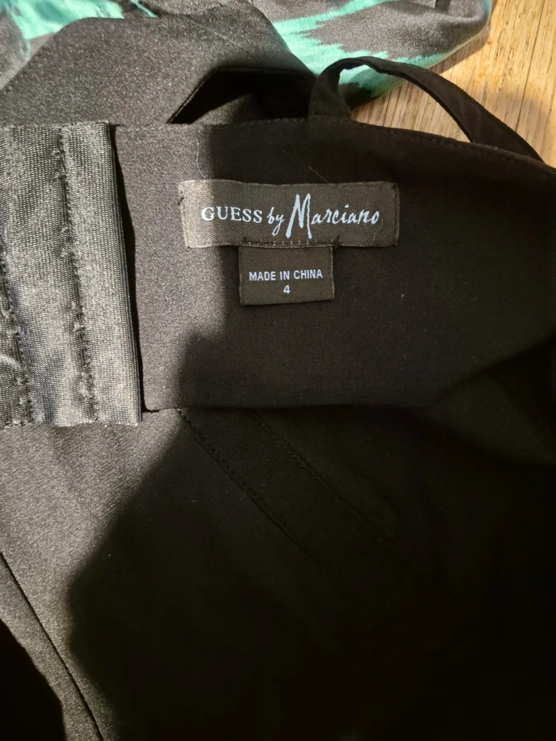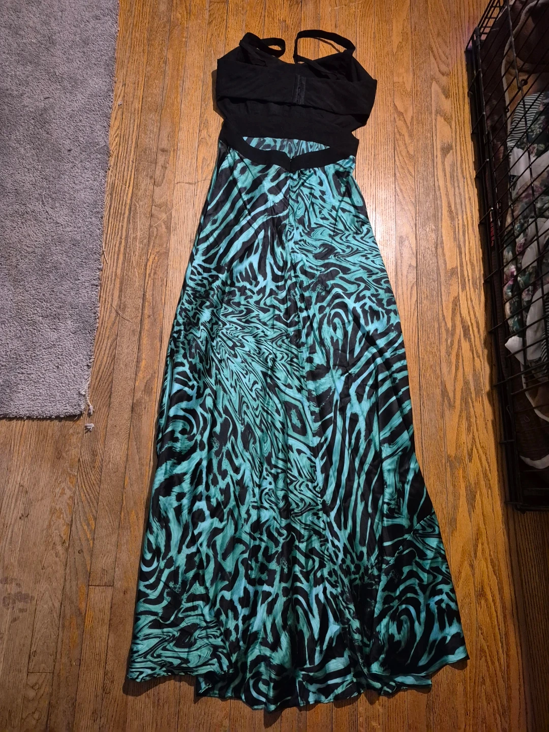 Guess by Marciano dress with a black bodice and a flowing teal and black animal print skirt. It's size 4. Made in China.