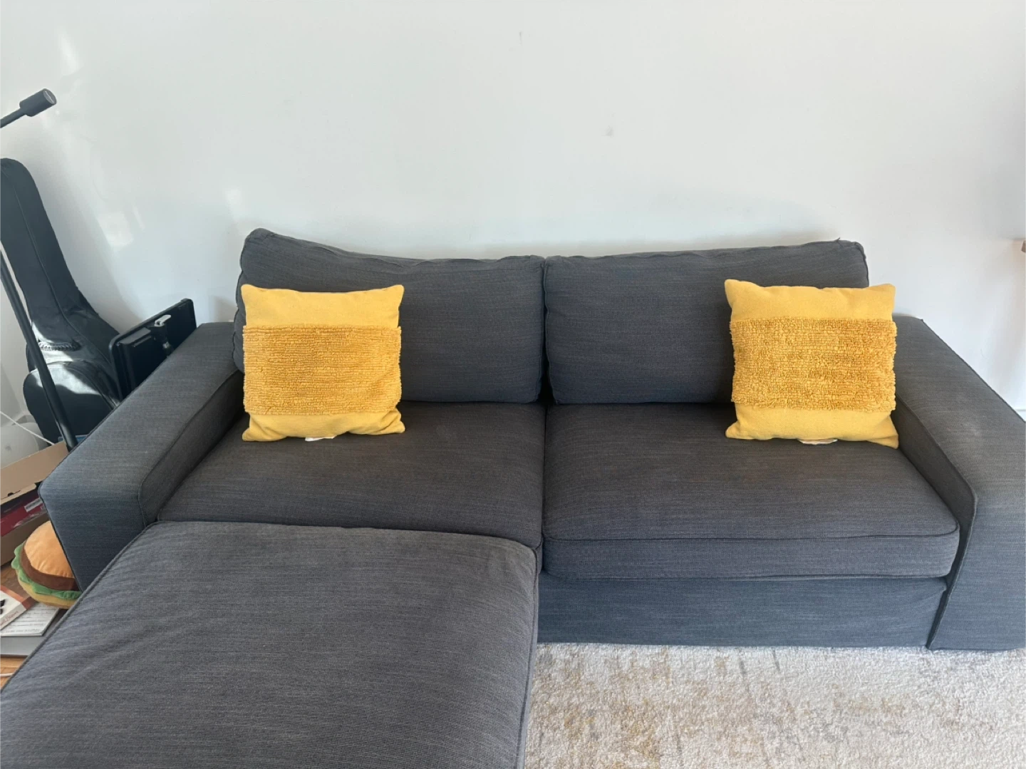 Dark Gray Ikea Sectional Sofa with Chaise and Yellow Pillows