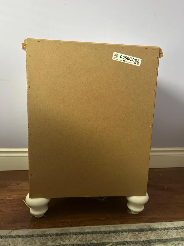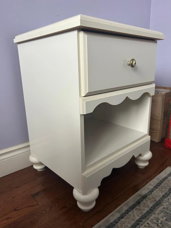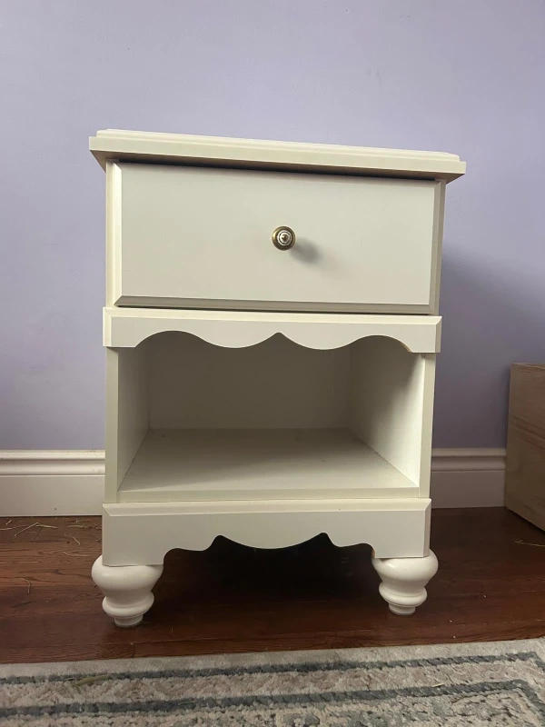 A white nightstand featuring one drawer and an open shelf. It sits on four decorative legs.