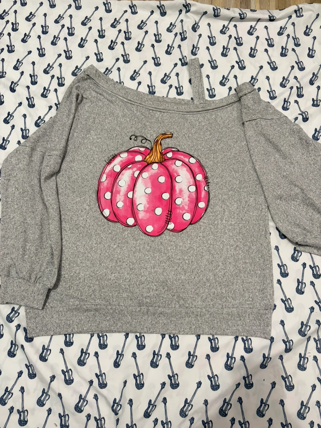 Gray off-the-shoulder long sleeve top with a cute pink polka dot pumpkin graphic. It's made from a soft blend of 95% Polyester and 5% Elastane. This top is size large.