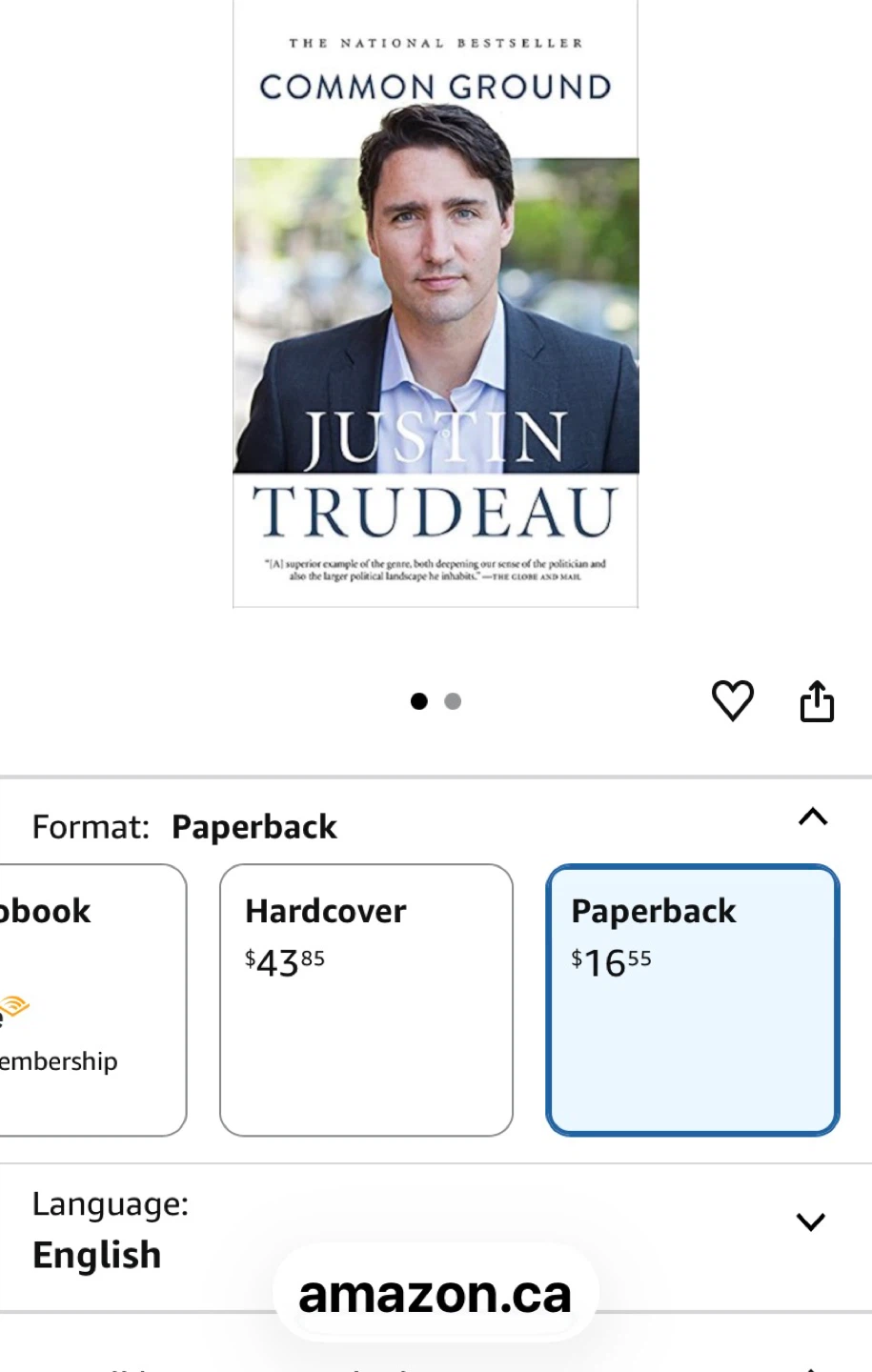This is the national bestseller, Common Ground, written by Justin Trudeau. It's a paperback edition. This book explores various aspects of politics and society. It was published in English.