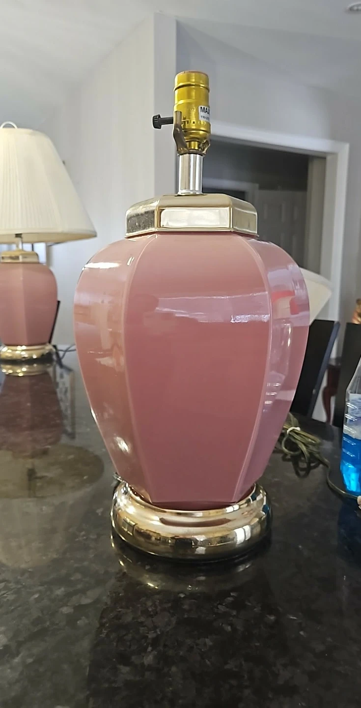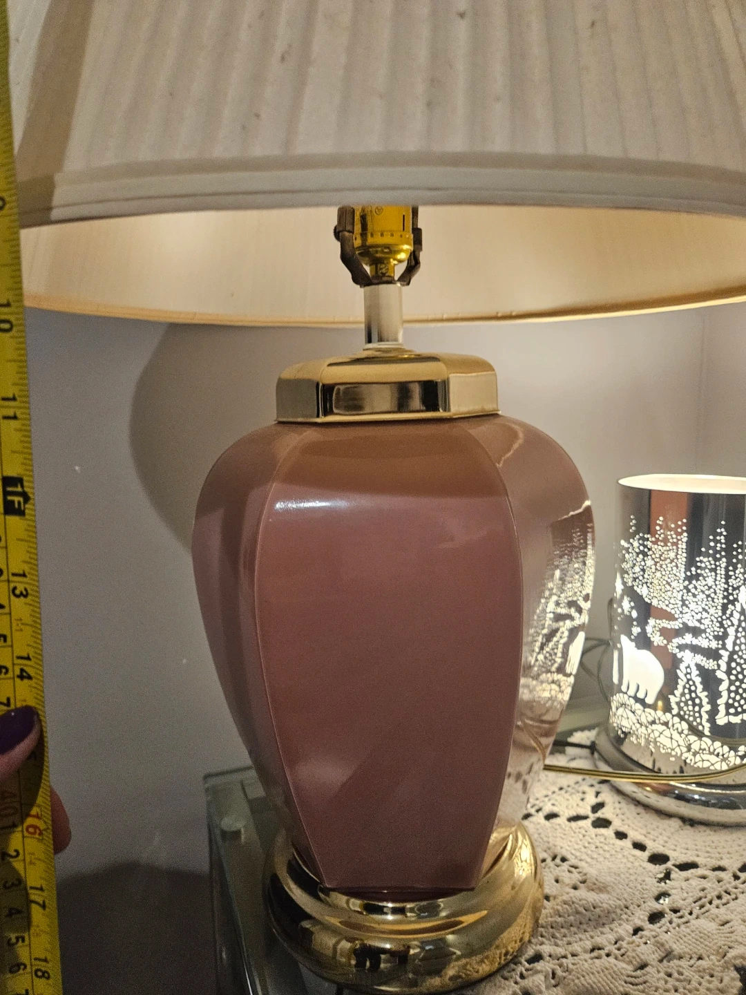 This is a lovely pink ceramic table lamp with a decorative gold-toned base. It stands approximately 17 inches tall, including the harp. It's perfect for adding a touch of vintage charm to any room.