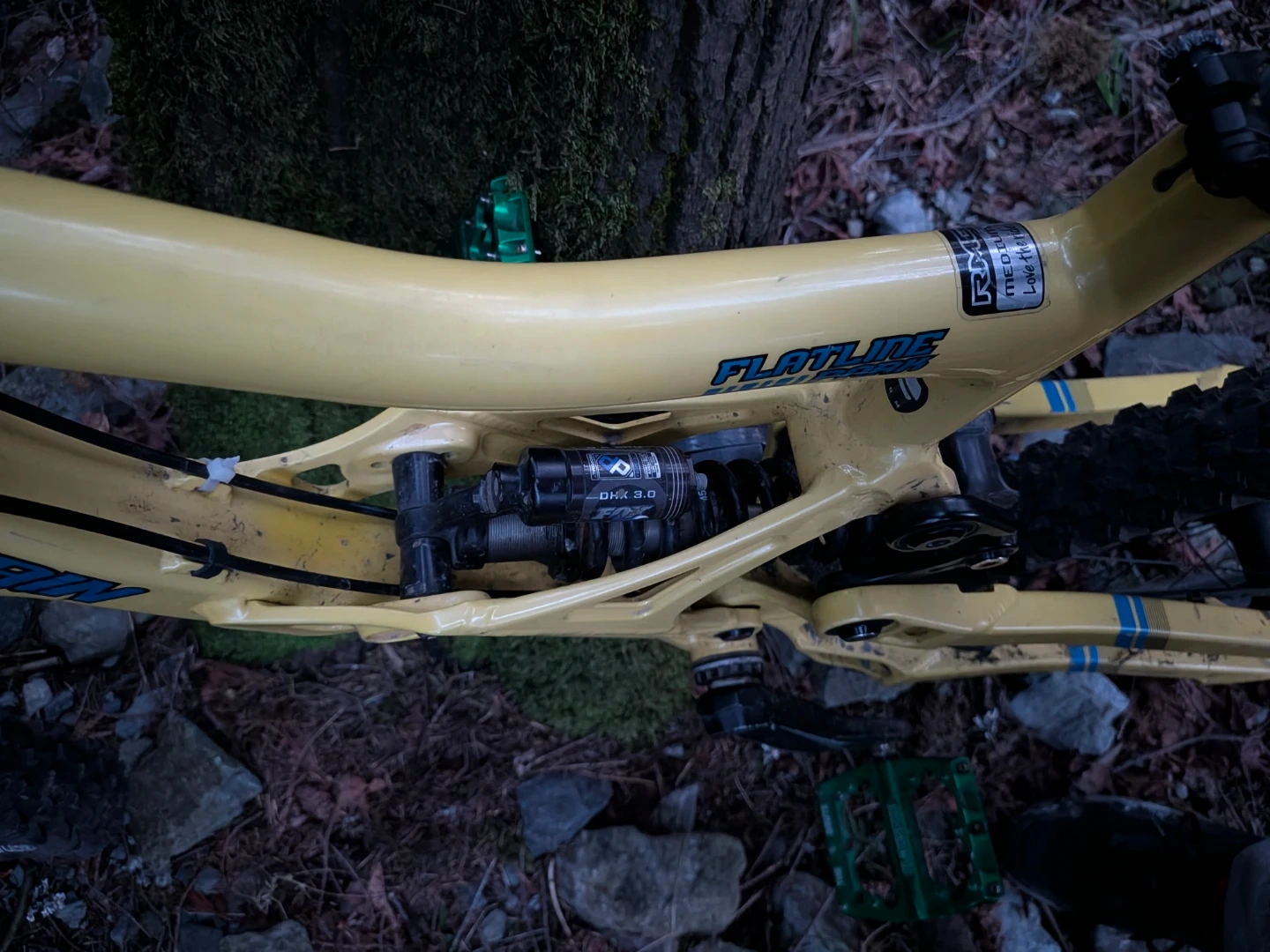 Yellow Rocky Mountain Flatline park downhill bike. Features a DHX 3.0 rear shock and Fox front suspension. Green pedals included. This bike's built for shredding the trails!