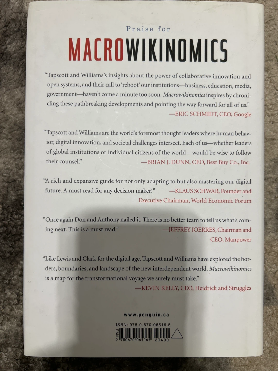 Selling a copy of Macrowikinomics by Don Tapscott and Anthony D. Williams! This book explores the power of collaborative innovation and open systems