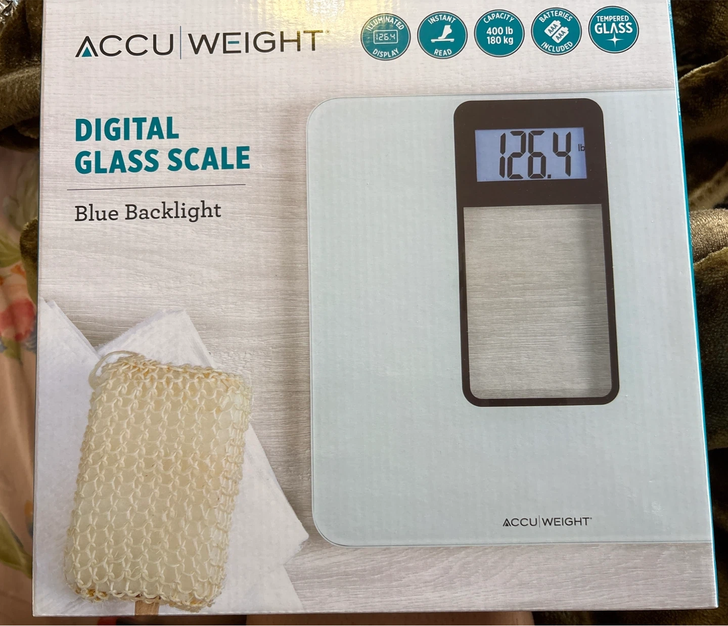 This Accu Weight digital glass scale has an illuminated display with blue backlight.