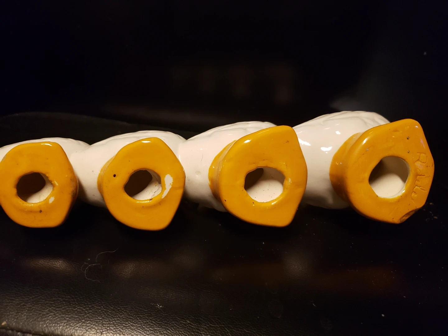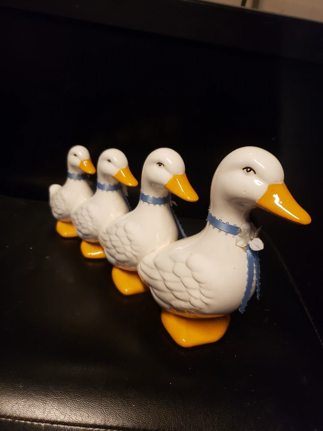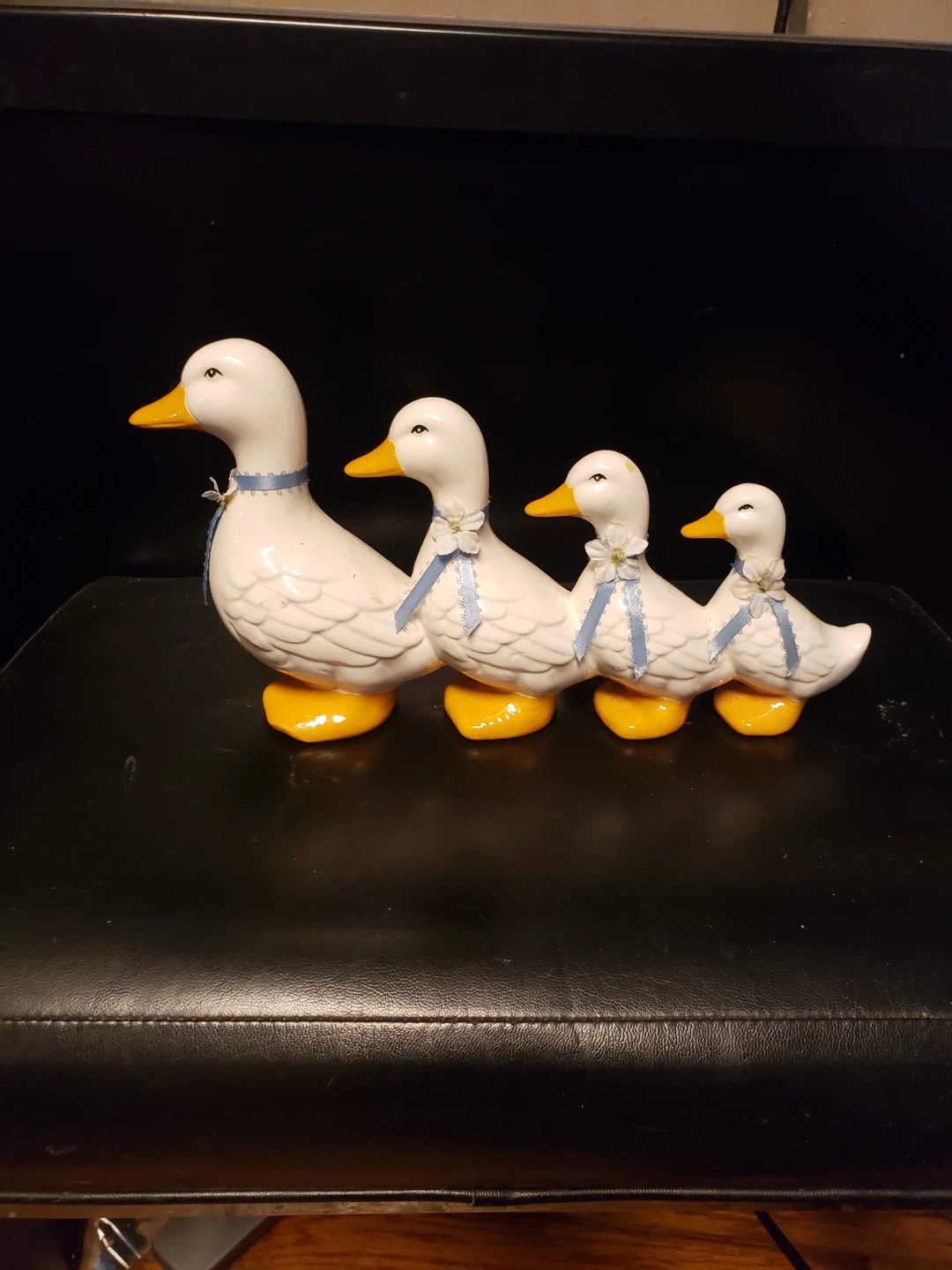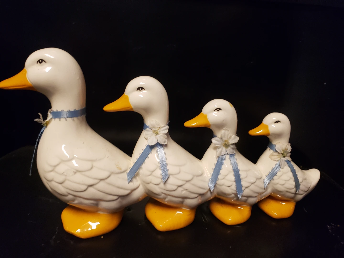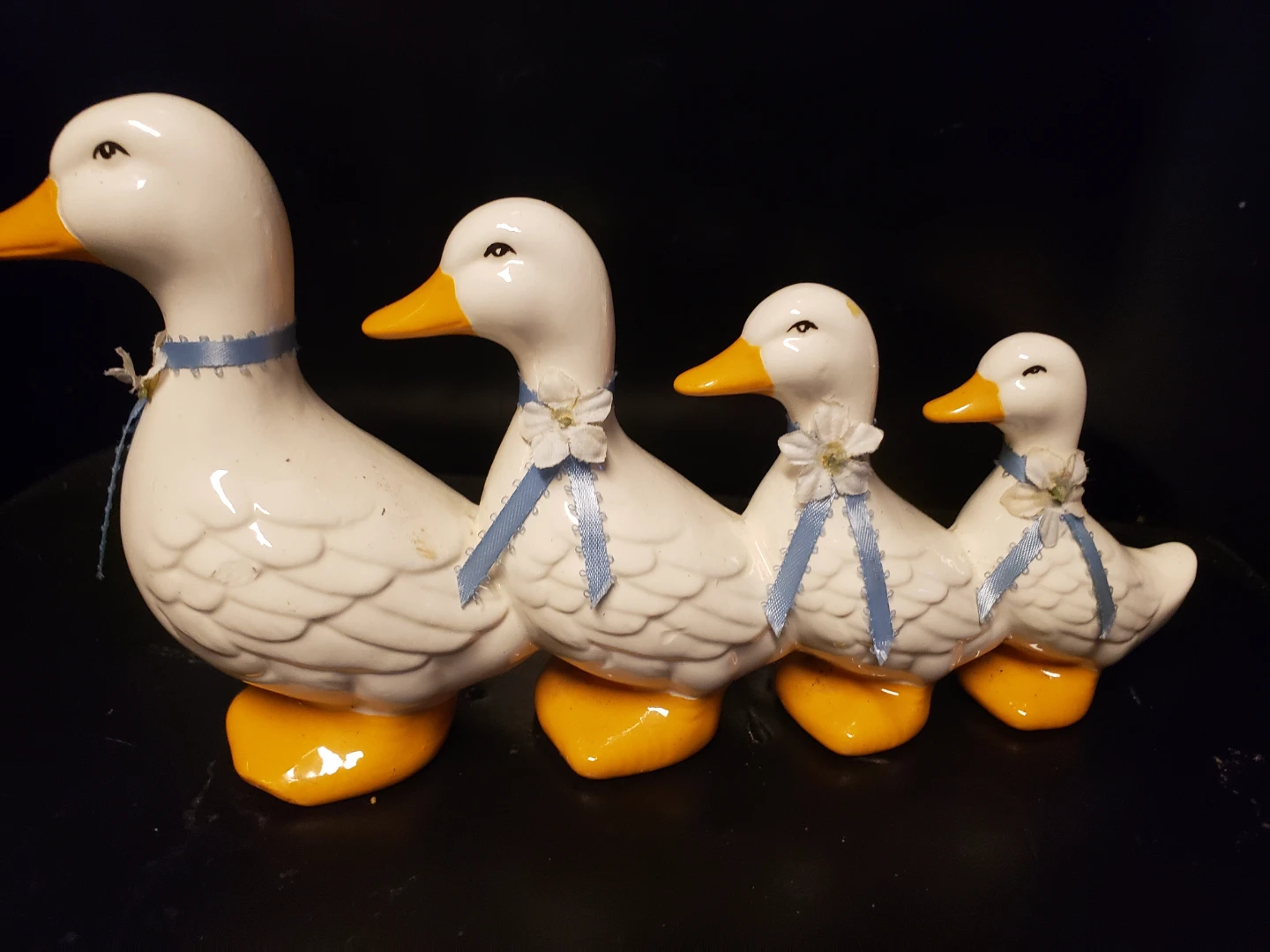 A set of four white ceramic duck figurines. They're decorated with yellow beaks and feet, and have blue ribbons with small white flowers around their necks. These cute ducks are linked together in a line, perfect for adding a whimsical touch to your decor.