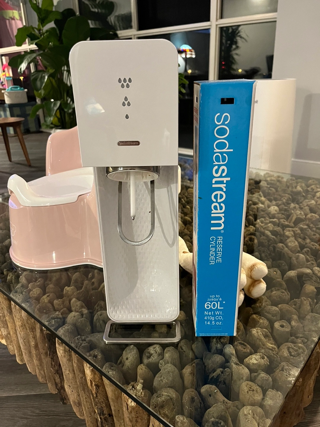 White SodaStream sparkling water maker. Includes a CO2 cylinder.