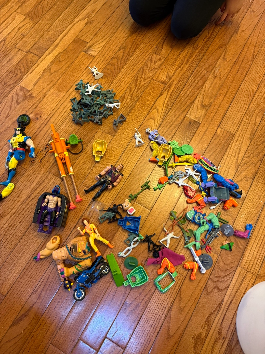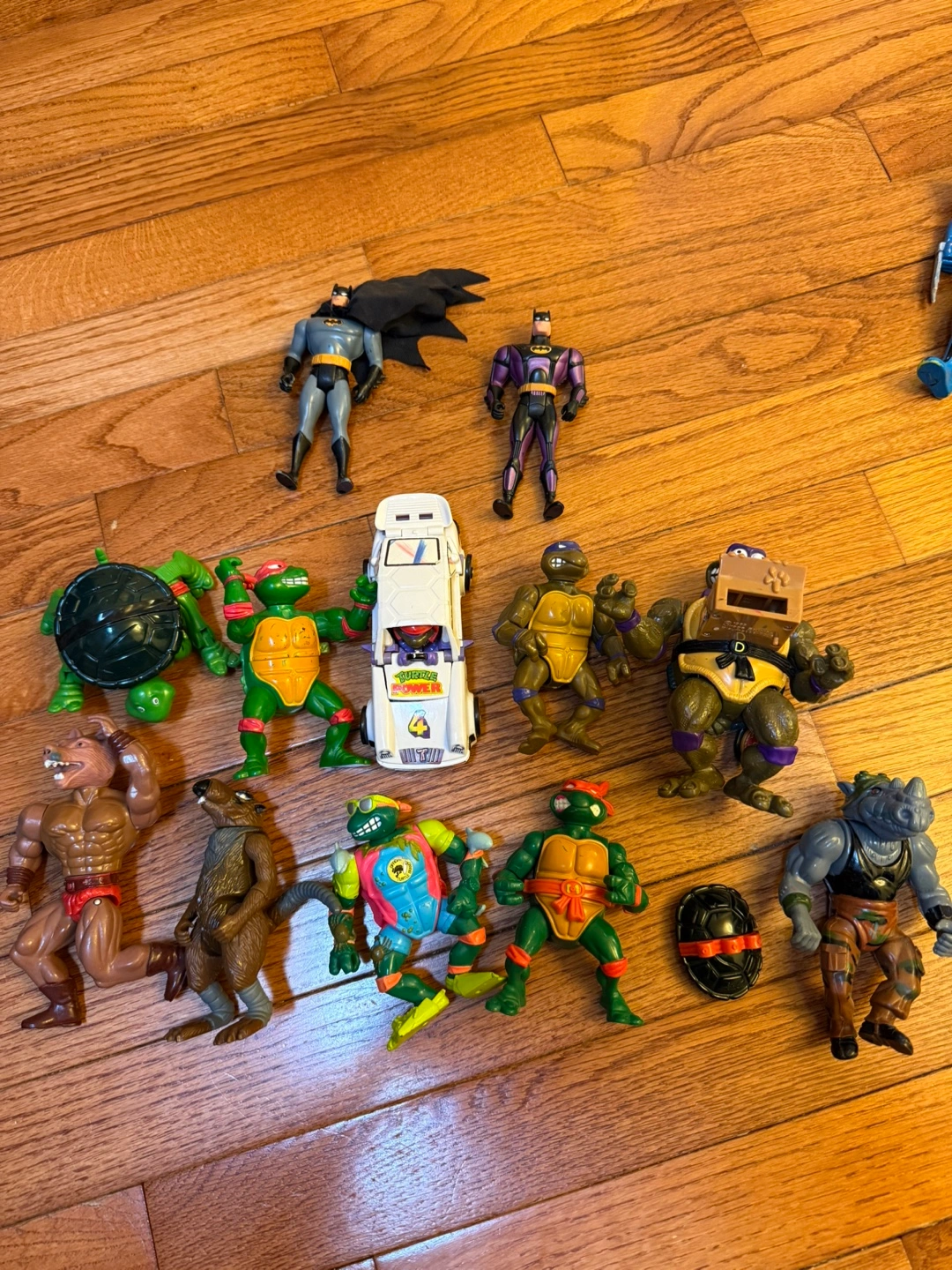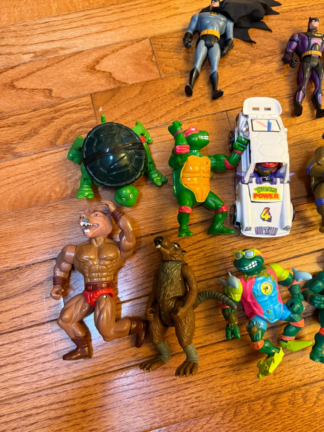 Collection of vintage action figures. Includes Teenage Mutant Ninja Turtles figures, vehicles, and accessories. Also features Batman figures. Great for collectors or nostalgic fans.