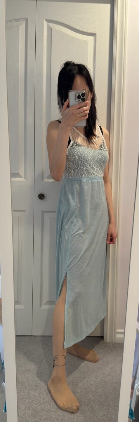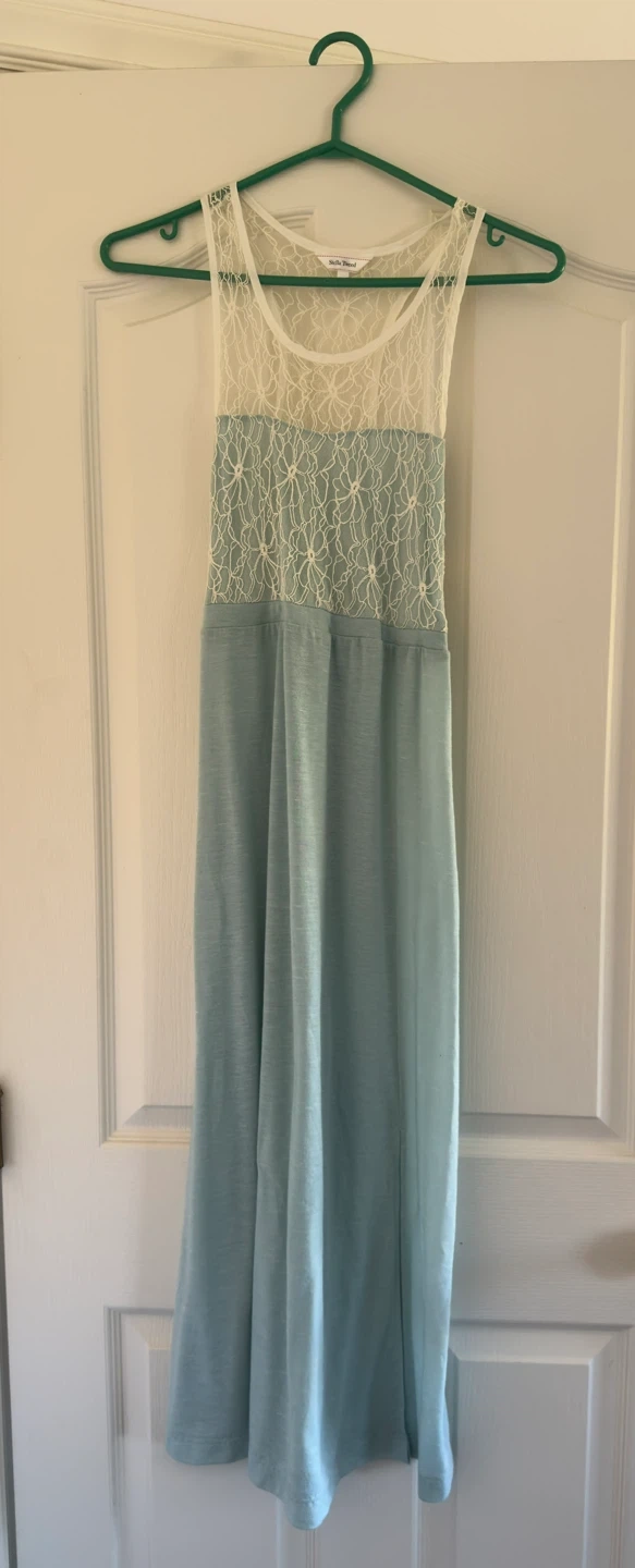 It features a beautiful lace top and a flowy bottom. The dress is a size small and is in great condition. It's a lovely light blue colour and super comfy