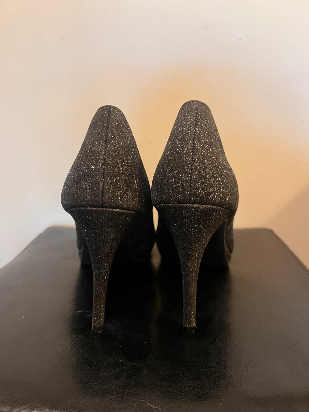 These are a pair of heels in a sparkly black colour. They are a size 11 and would be great for a night out! Worn once for a photoshoot.