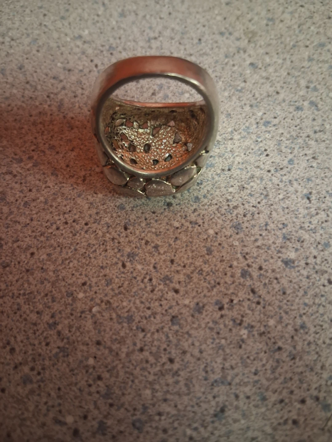 Selling a silver-tone ring with a unique, textured design. It's a statement piece that's sure to catch the eye! The ring is in good condition and ready for a new home