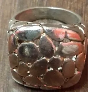 Selling a silver-tone ring with a unique, textured design. It's a statement piece that's sure to catch the eye! The ring is in good condition and ready for a new home