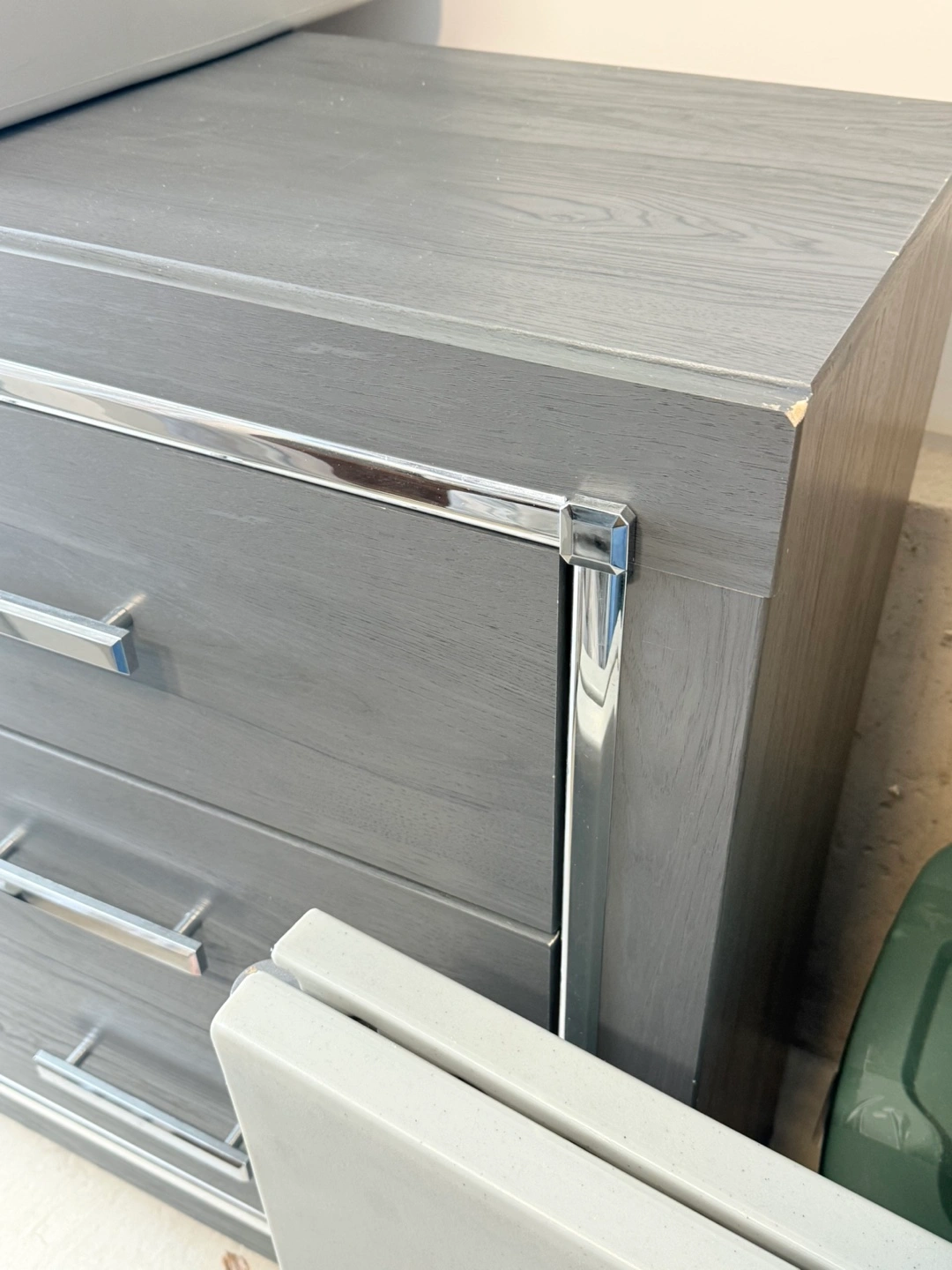Tall six-drawer dresser. Dark grey finish. Silver accents. Modern style. Excellent condition.