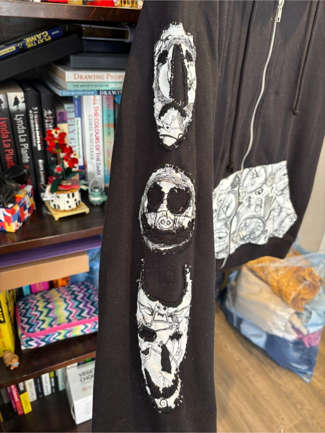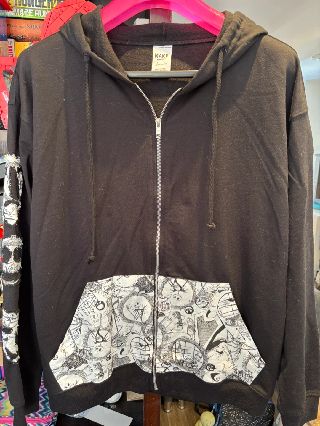 This black zip-up hoodie features a Jack Skellington graphic on the back. The sleeves have stitched character appliques, and the pocket lining has a "Nightmare Before Christmas" print. It's a comfortable and unique piece for any fan!