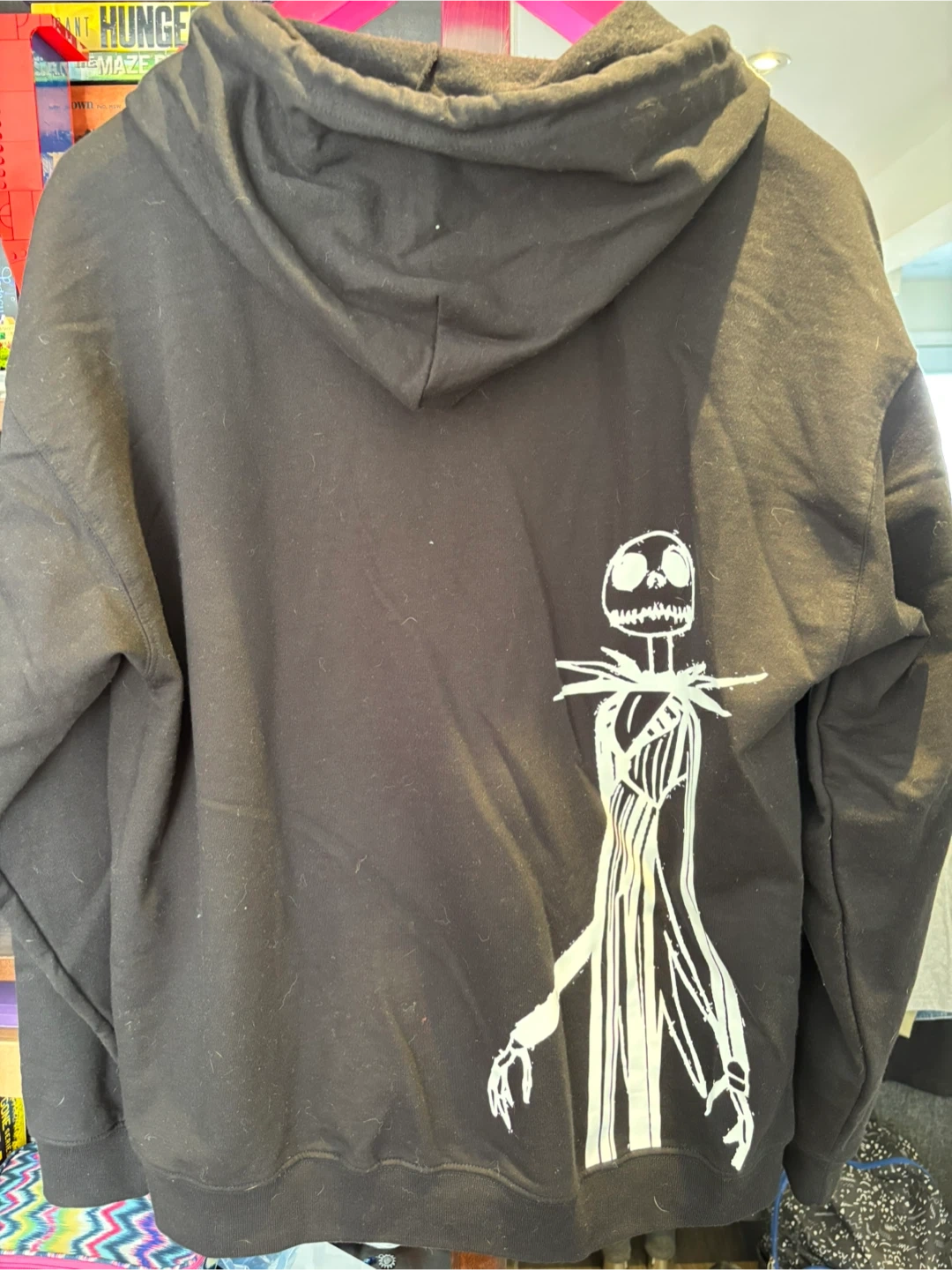 This black zip-up hoodie features a Jack Skellington graphic on the back. The sleeves have stitched character appliques, and the pocket lining has a "Nightmare Before Christmas" print. It's a comfortable and unique piece for any fan!