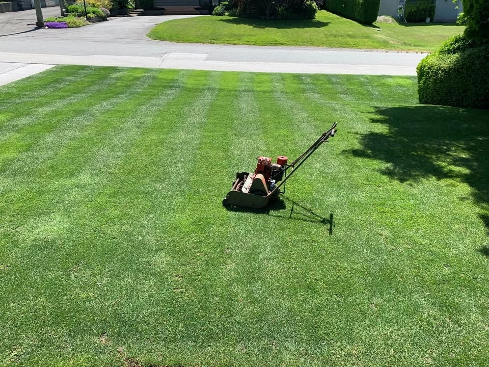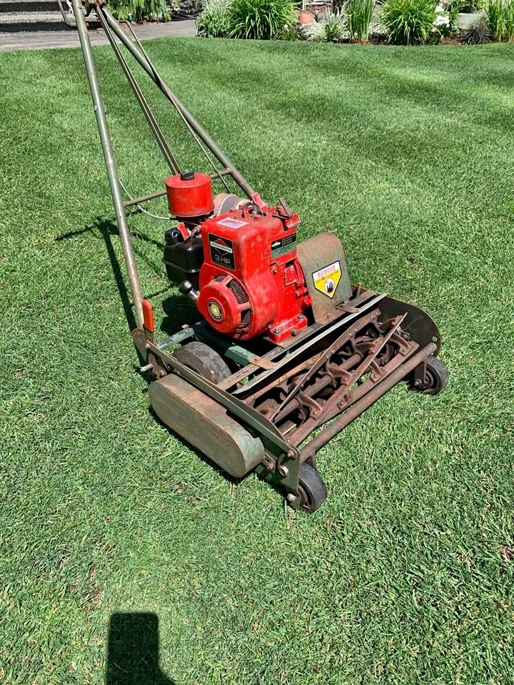 Well maintained: 5 blade and bedknife sharpened, bedknife replaced 2ish years ago with a new, removable one, recently serviced and backlapped. Runs great and cuts clean! Easy height adjustment and simple to use.