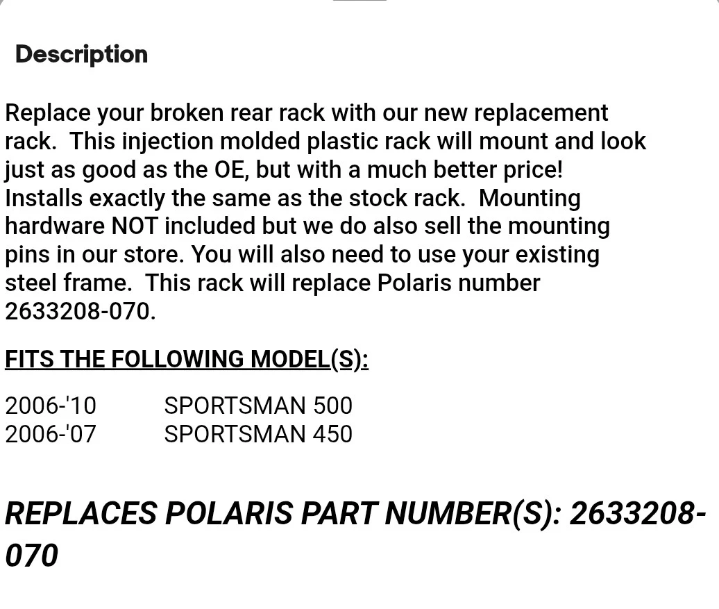Replacement injection molded plastic rear rack for Polaris Sportsman 500 (2006-2010) and Sportsman 450 (2006-2007). This rack replaces Polaris part number 2633208-070. It's designed to mount and look like the original equipment. You'll use your existing steel frame for installation.